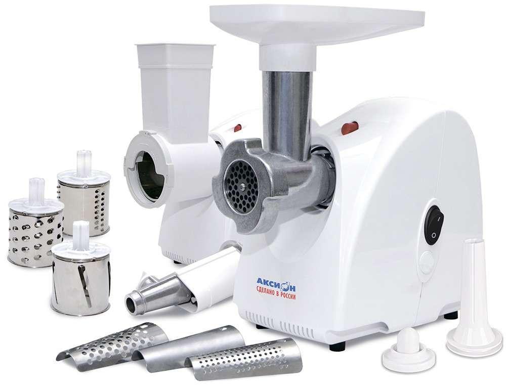 мощность 230 Вт, перерабатывает 1.7 кг/мин, насадка-терка, насадка для приготовления колбас, насадка для шинковки, насадка для кеббе, диск для фарша, корпус из пластика, шнековая соковыжималка, отсек для хранения насадок