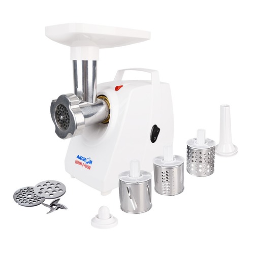 мощность 1500Вт, производительность 1.6кг/мин; количество скоростей 1; защита от перегрева; насадка для колбас; насадка для кеббе; насадка для шинковки; материал лотка пластик; цвет белый