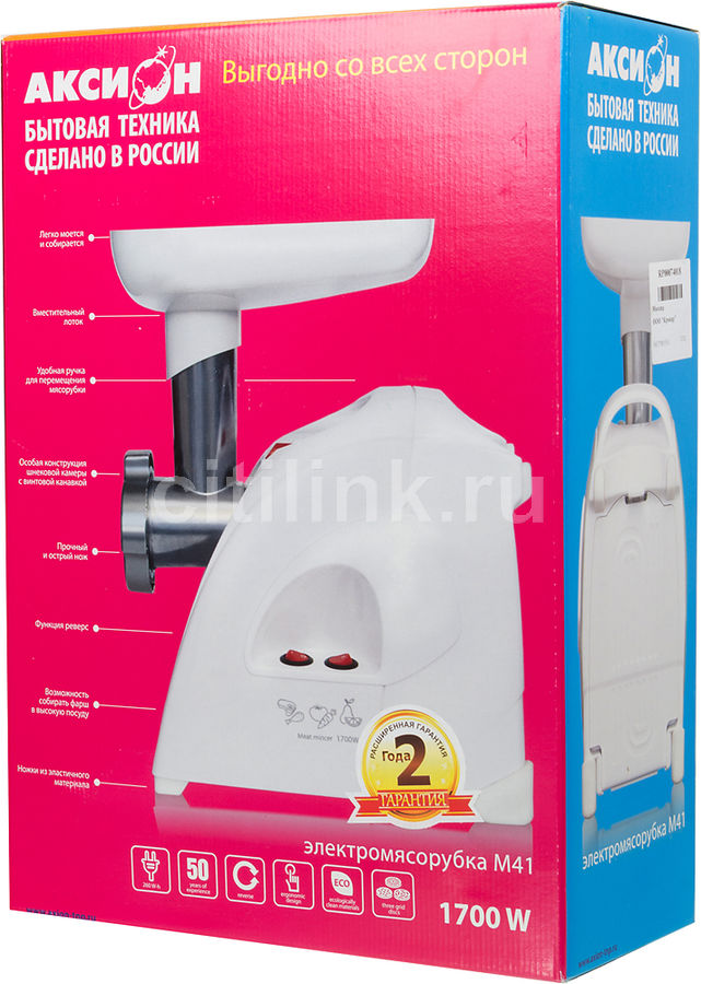 Значительно упростила жизнь многих хозяек мясорубка АКСИОН М 41.02. С ее помощью можно не только перемалывать мясо, но и совершать великое множество других операций. Терка для овощей, например, имеет 4 сменных барабана, каждый из которых предназначен для измельчения разной степени и формы. Есть в комплекте и насадка для приготовления соков с мякотью из мягких сортов овощей, фруктов и ягод. Если при перемалывании вдруг возникли проблемы, то стоит только воспользоваться функцией реверса и неперемолотый кусочек выйдет, после чего можно продолжить работу. Мясорубка АКСИОН М 41.02 позволяет радовать близких свежей домашней колбасой, если использовать соответствующую насадку. Вам даже не придется прятать свою помощницу в шкаф, так как она не занимает много места и всегда должна быть под рукой. Для удобства в корпусе предусмотрен отсек для шнура. Все съемные детали изготовлены из пластика и очень легко моются.
