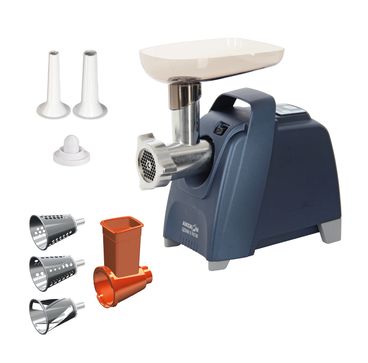 Мясорубка с электронным управлением. Макс. мощность 2000 Вт Защита двигателя от перегрузки. Максимальная производительность – 4 кг/мин. Приставка для набивки колбас (2шт.). Приставка кеббе. Приставка-овощерезка АМ11.03-4 (4 барабана). Лоток. 3 решетки (с мелкими, крупными и продолговатыми отверстиями). Отсек для хранения шнура питания и принадлежностей. Реверс.