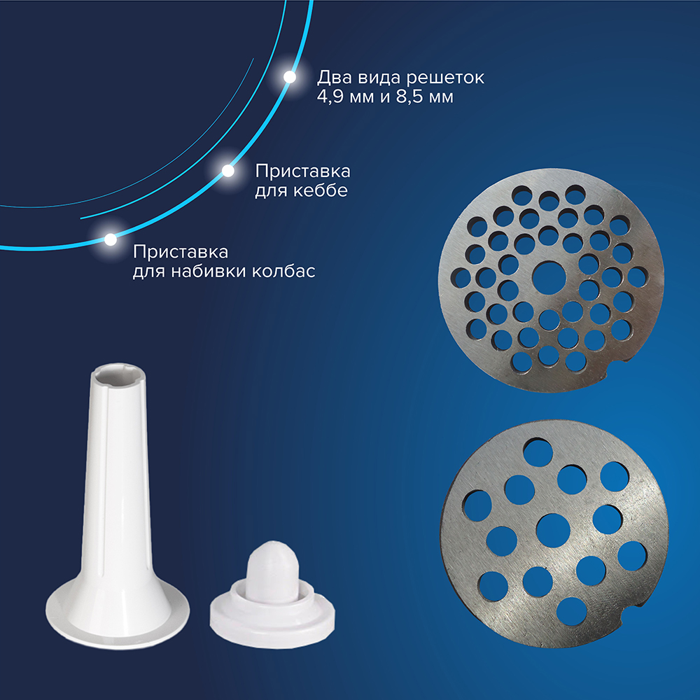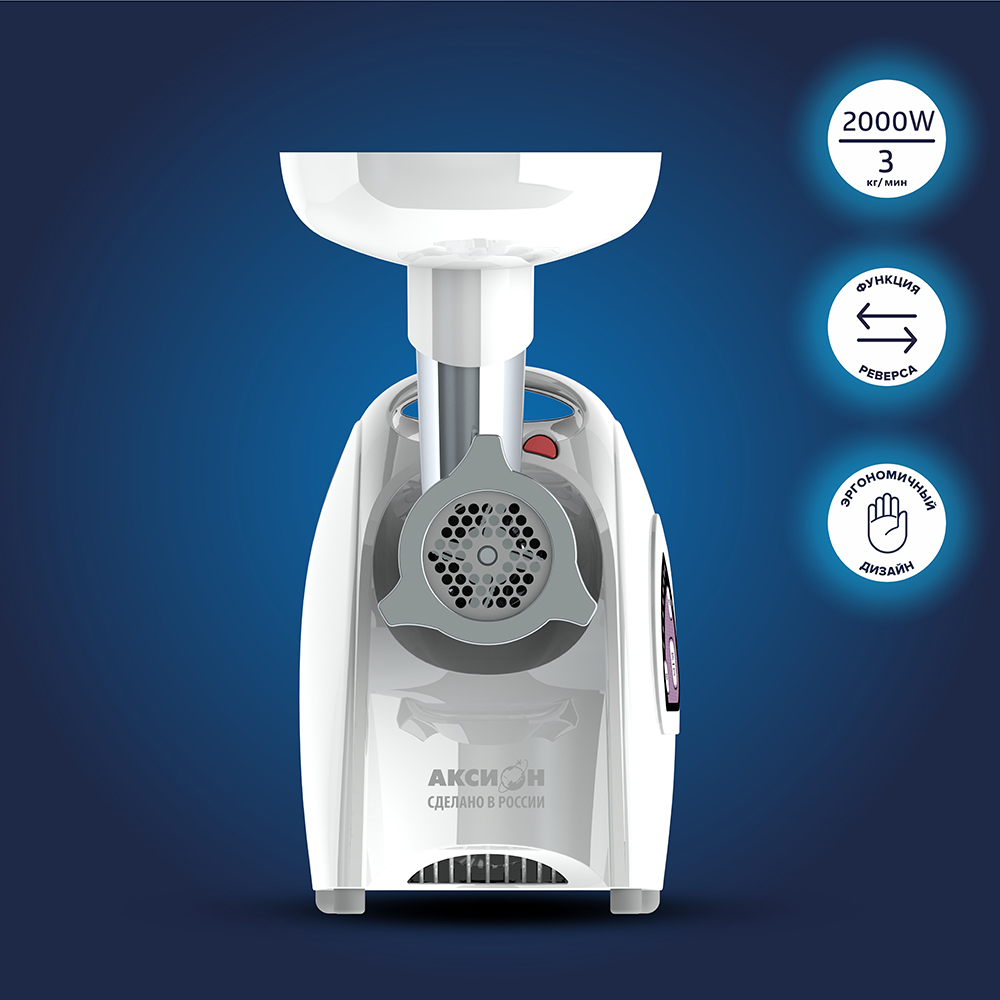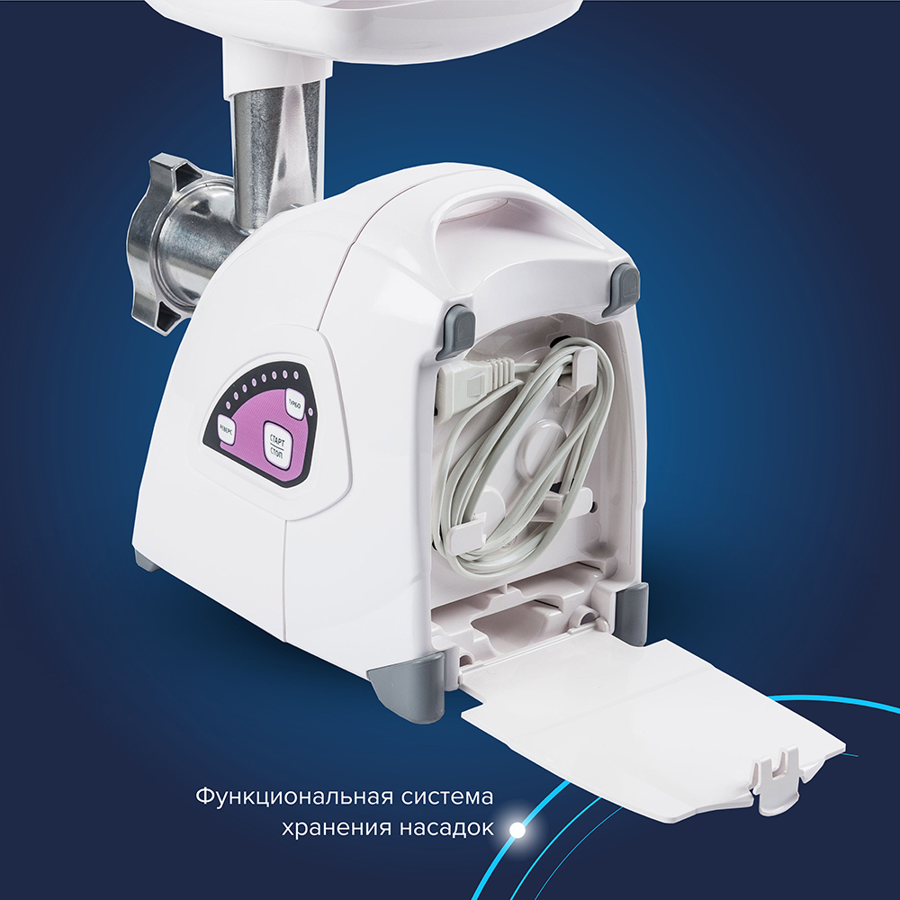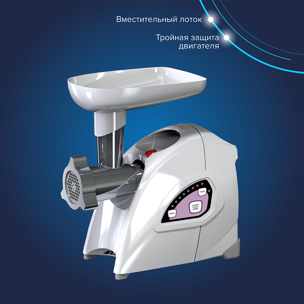 Электрическая мясорубка отличается электронным управлением, и, как следствие, высокой надежностью. Трехуровневая защита от перегрузок не позволит мясорубке сломаться при попадании костей в шнековую камеру, а также при длительной работе на предельных нагрузках. Световая индикация покажет степень нагрузки на двигатель, чтобы своевременно ее оптимизировать.