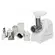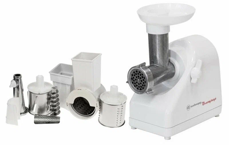 защита от перегрузки, мытье в посудомоечной машине, отсек для сетевого шнура, отсек для хранения насадок, прорезиненные ножки, Номинальная мощность 220 Вт.Время непрерывной работы 5 мин, насадки для приготовления колбас, система реверса, толкатель