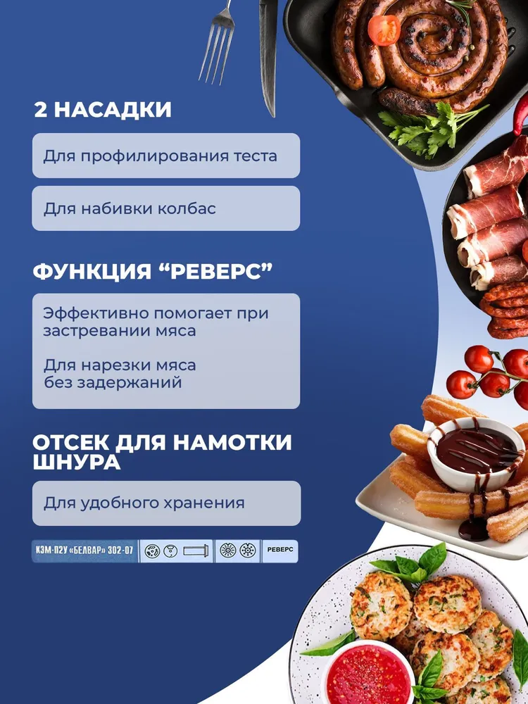 Мощная электрическая мясорубка Белвар КЭМ-П2У 302-07 станет надежной помощницей на Вашей кухне. Она идеально впишется как в квартире так и на даче имеет стильный и эргономичный дизайн. Данная модель имеет надежный мотор 220 Вт, максимальная мощность при блокировке вала 1500 Вт. Благодаря данным показателям мясорубка выдает производительность 24 кг/час. С помощью данной модели Вы сможете приготовить фарш из сырого и отварного мяса. Модель функциональна имеет насадку для домашней колбасы, что позволит Вам удивить гостей на любом празднике дома или барбекю на природе. Модель оснащена функцией "Реверс". Электромясорубка- помощница на вашей кухне, призвана облегчить ручной труд хозяйки. Мясорубка выполнена в стильном компактном корпусе из ABS пластика с легкостью справится с поставленной задачей и станет незаменимой помощницей при приготовлении множества блюд. Имеющаяся в комплекте насадка для профилирования теста, поможет Вам приготовить украшения для пирога или вкусное печенье для Ваших детей. Удобства использования отсек для шнура а также прорезиненные ножки пользоваться мясорубкой одно удовольствие. Данная модель предоставит вам возможность экономить время и готовить любимые блюда быстро и с удовольствием. Две сменные решетки (крупная и мелкая) помогут удовлетворить запросы любого дегустатора, как взрослого так и ребенка.