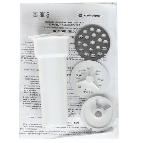Комплектация инструкция, 2 решетки для фарша, насадка для профилирования теста, насадка для колбас