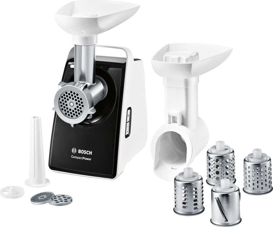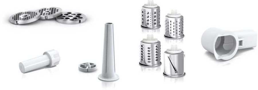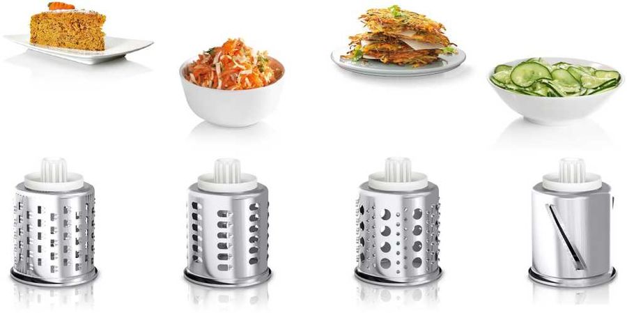 Особенности: Три перфорированных диска с отверстиям 2,7/4/8 мм. Насадка для шинковки – 4 барабана (3 терки, 1 шинковка)