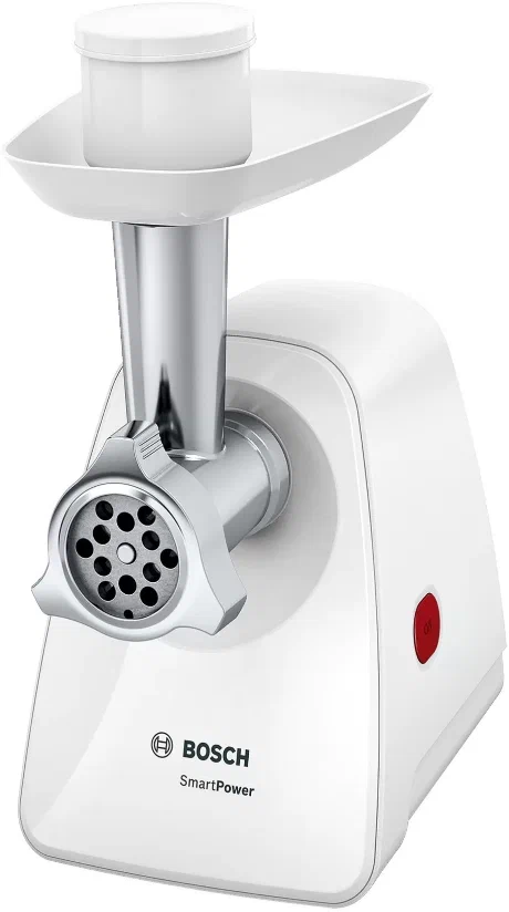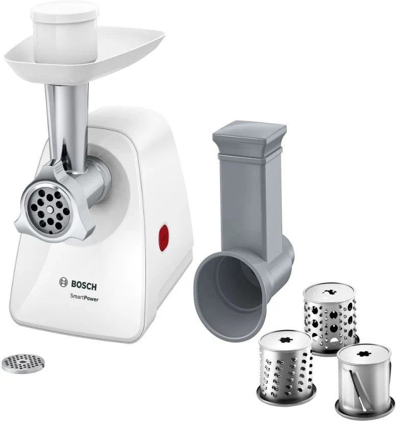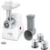 Электромясорубка, камера измельчения: 5 см, подключенная нагрузка: 350 Вт, мощность блокировки двигателя: 1500 Вт, производительность: 1,7 кг/мин, в комплекте решетки для фарша, слайсер с 3-мя режущими барабанами.