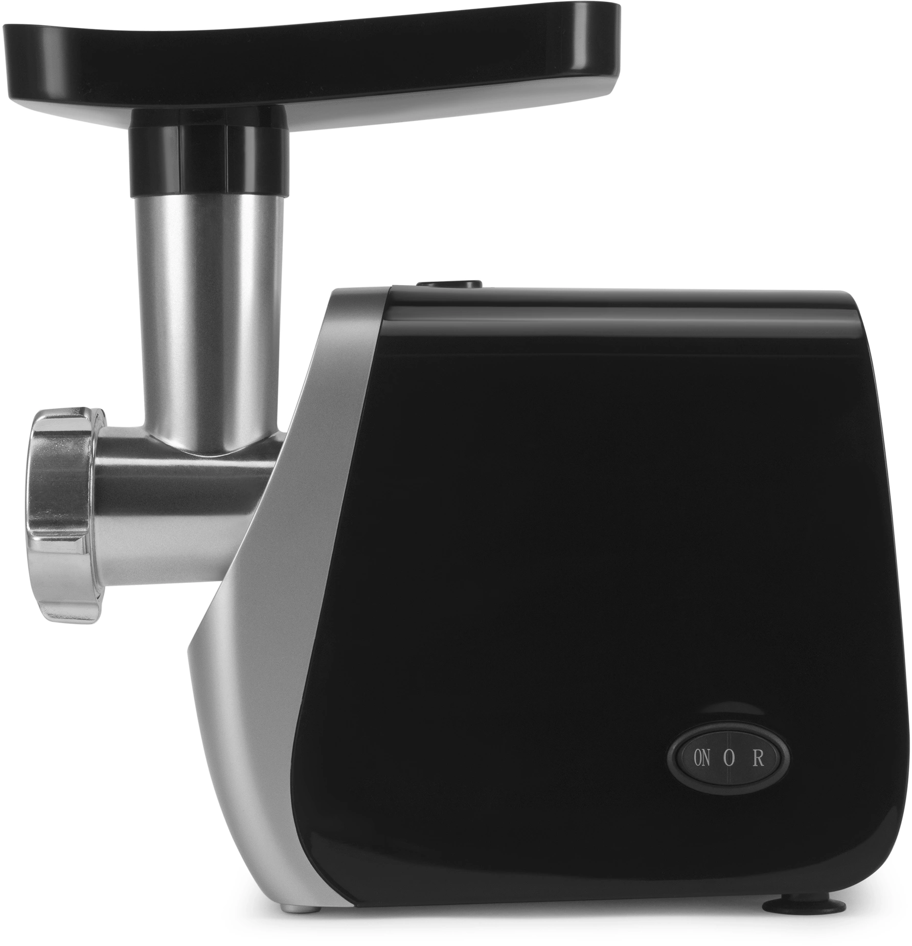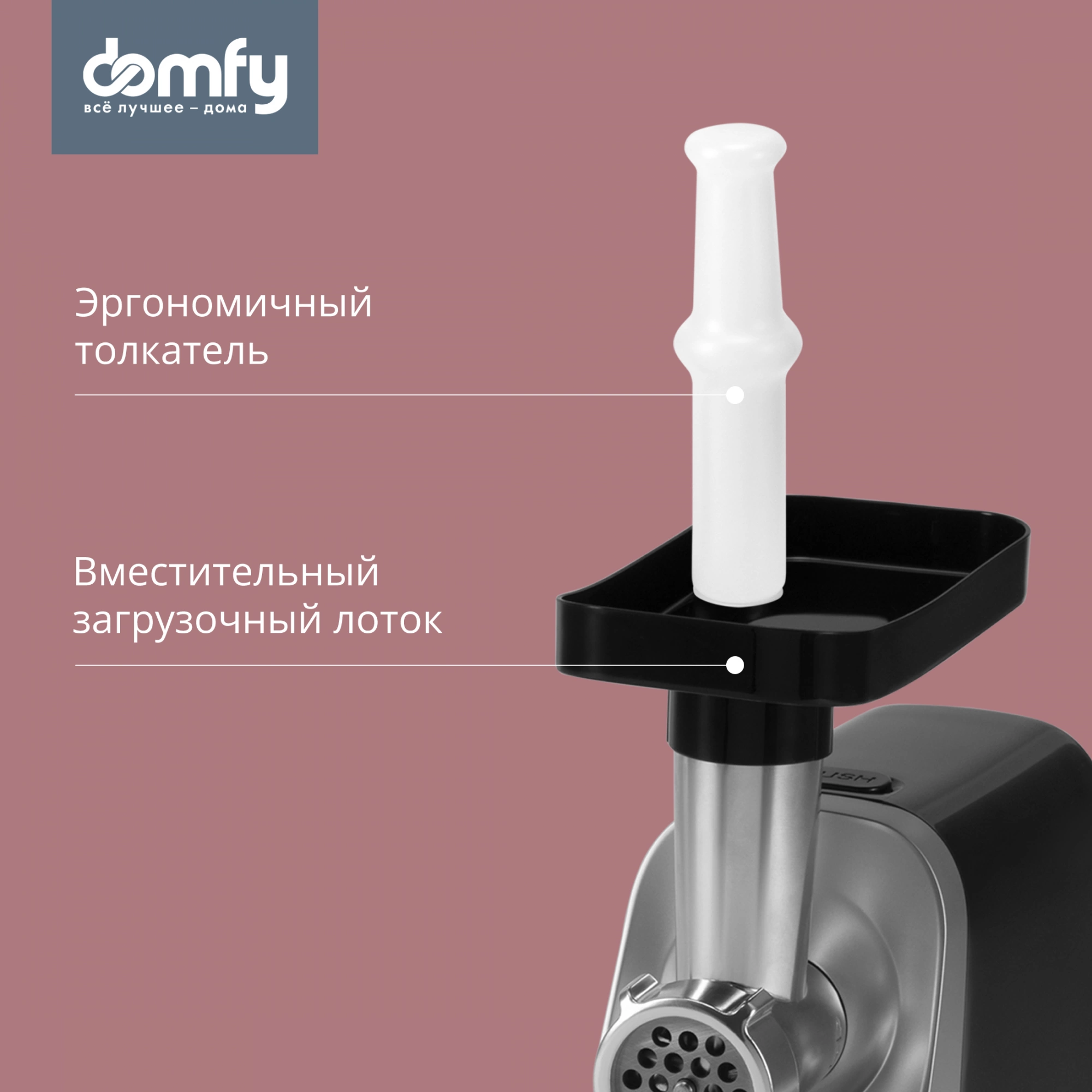 Загрузочный лоток и толкатель в комплекте. Удобный, объемный лоток и пластиковый толкатель позволяют быстро и безопасно перемещать мясо в приемную камеру.