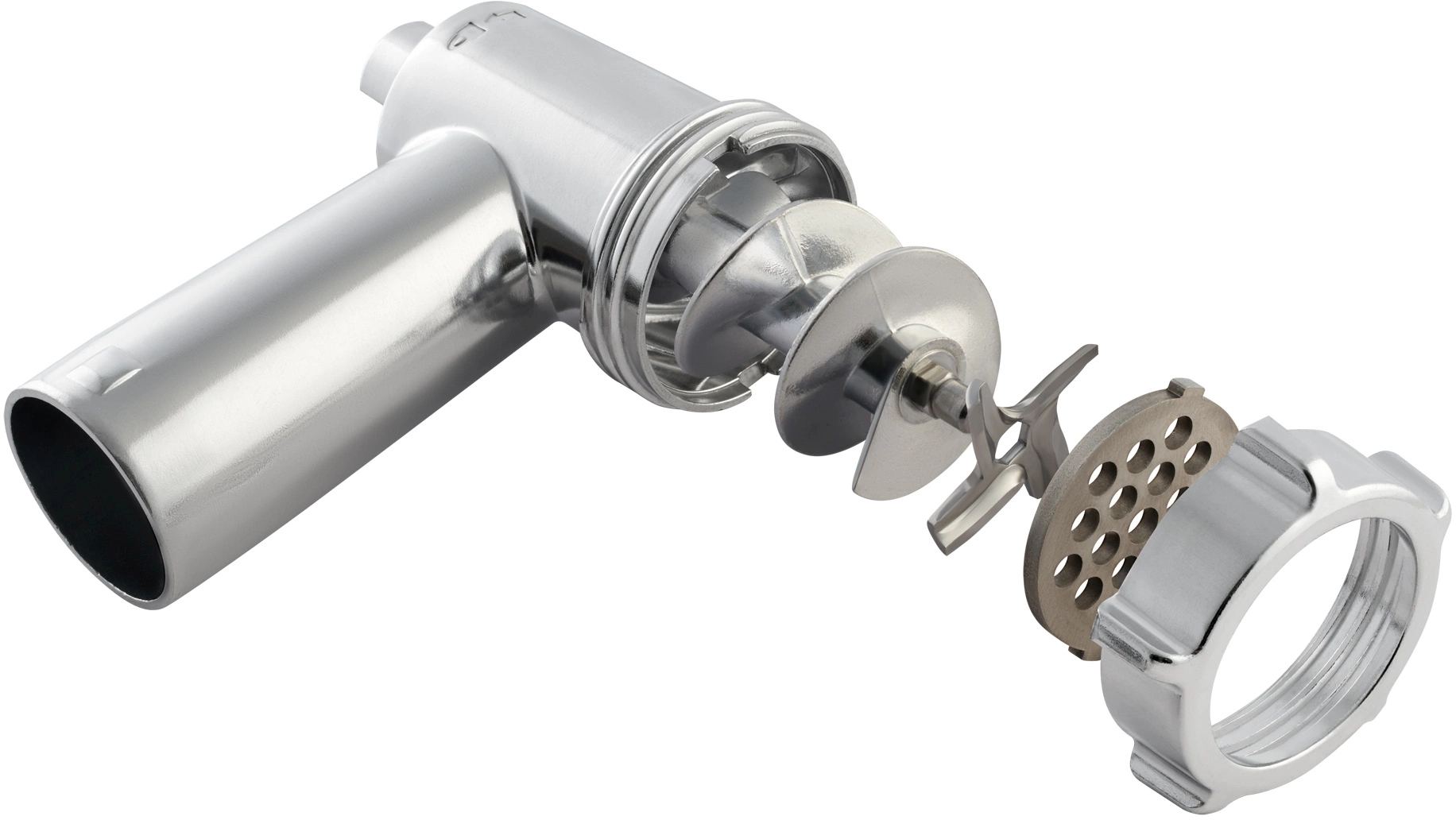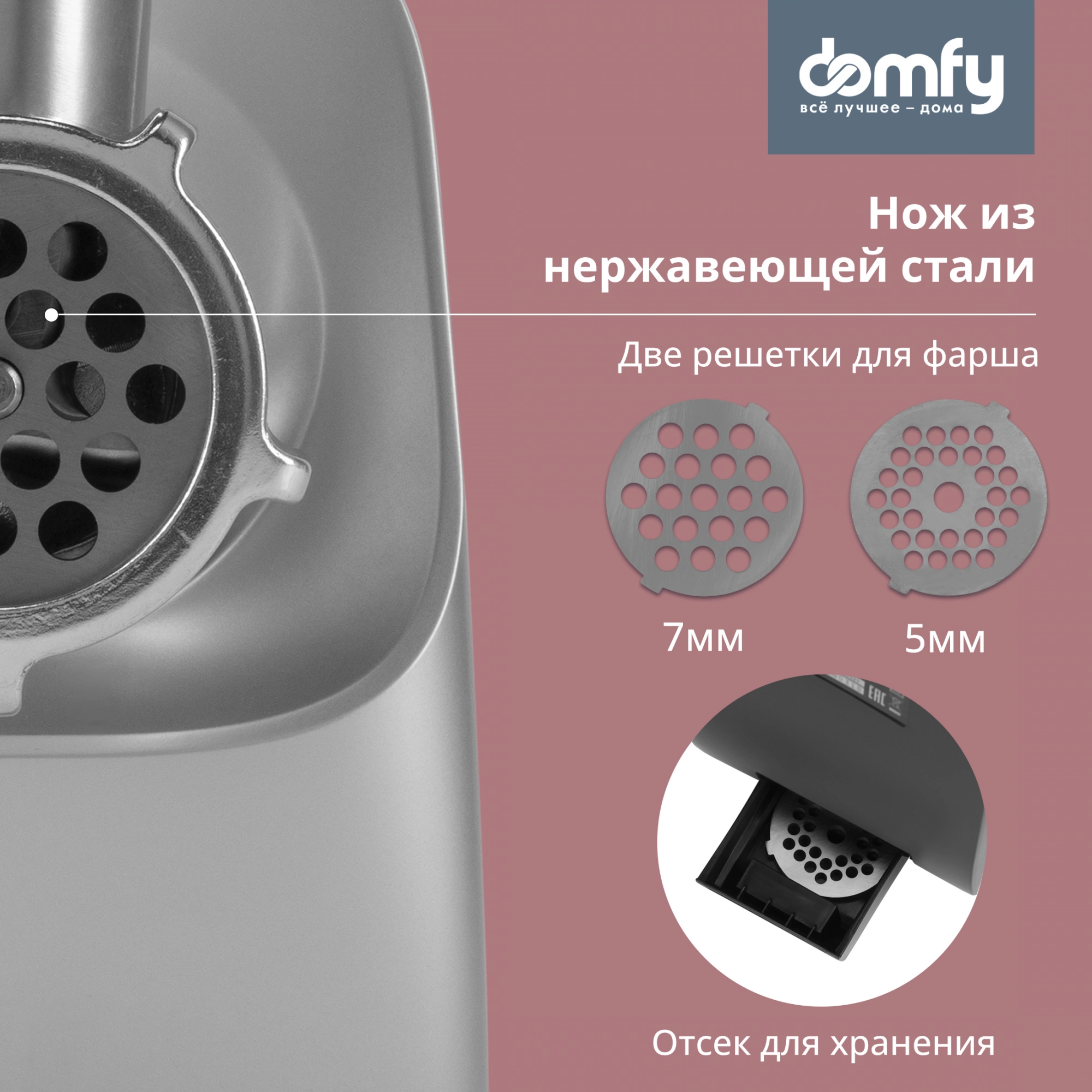 Нож из нержавеющей стали. Материал основных рабочих частей мясорубки устойчив к механическим нагрузкам и воздействию коррозии, что способствует продолжительному сроку её службы.