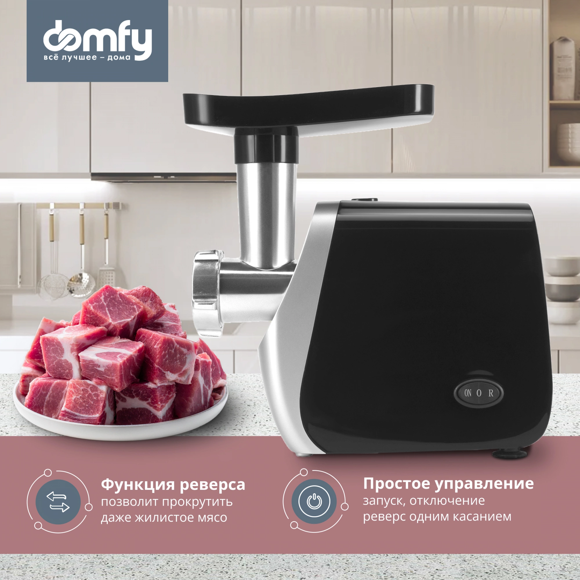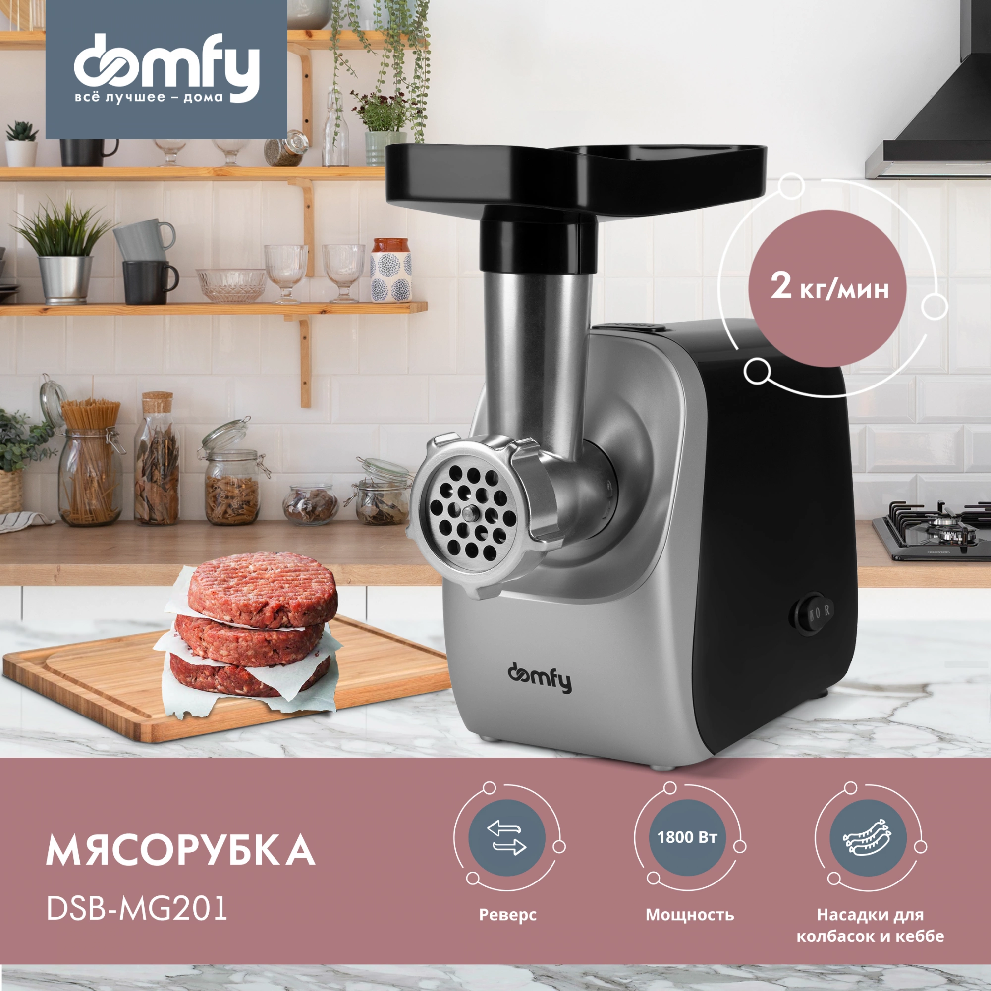 Электрическая мясорубка с реверсом DOMFY DSB-MG201, оснащенная двигателем мощностью 1800 Вт, поможет быстро и без усилий превратить мясо в фарш. Наличие в комплекте дополнительных насадок позволяет также готовить домашние колбаски и кеббе. Модель отличается высокой надежностью и простотой в применении.