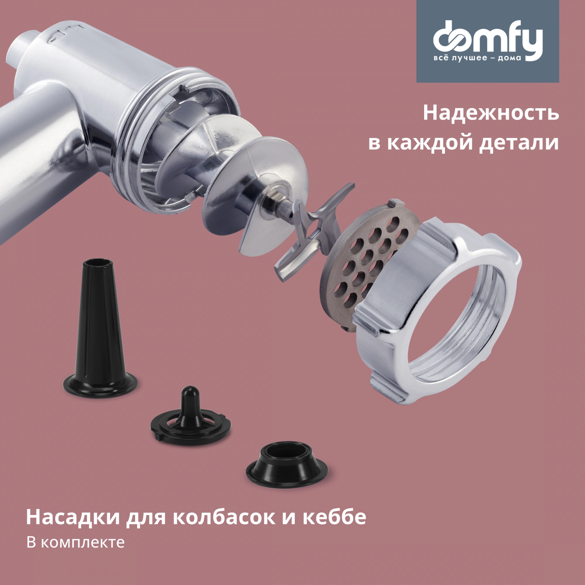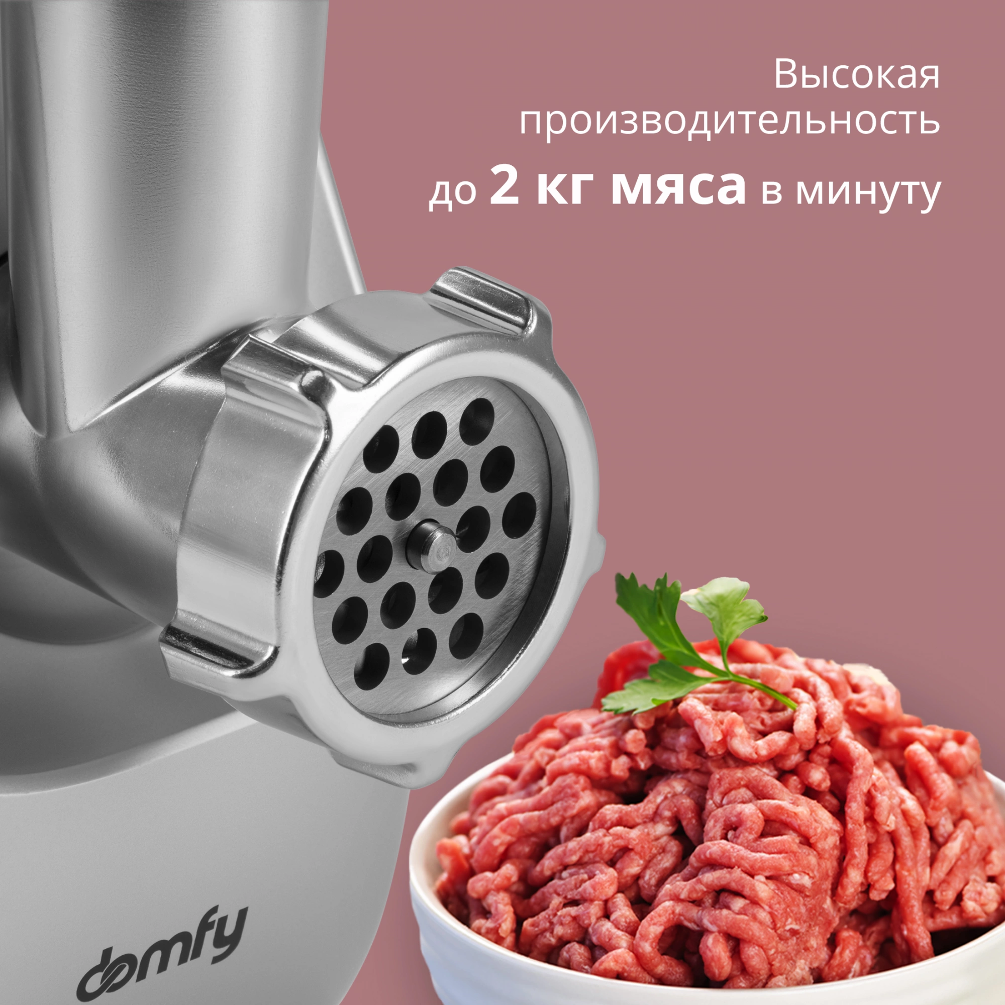 Высокая производительность. Электромясорубка DOMFY DSB-MG201 способна переработать до 2 кг мяса в минуту.