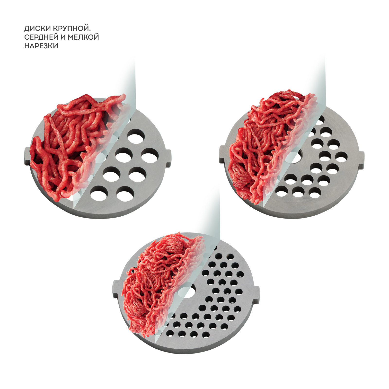 Диски мелкой, средней и крупной нарезки, а также дополнительные насадки для приготовления сосисок и «кеббе» позволят выбрать необходимую степень измельчения мяса.