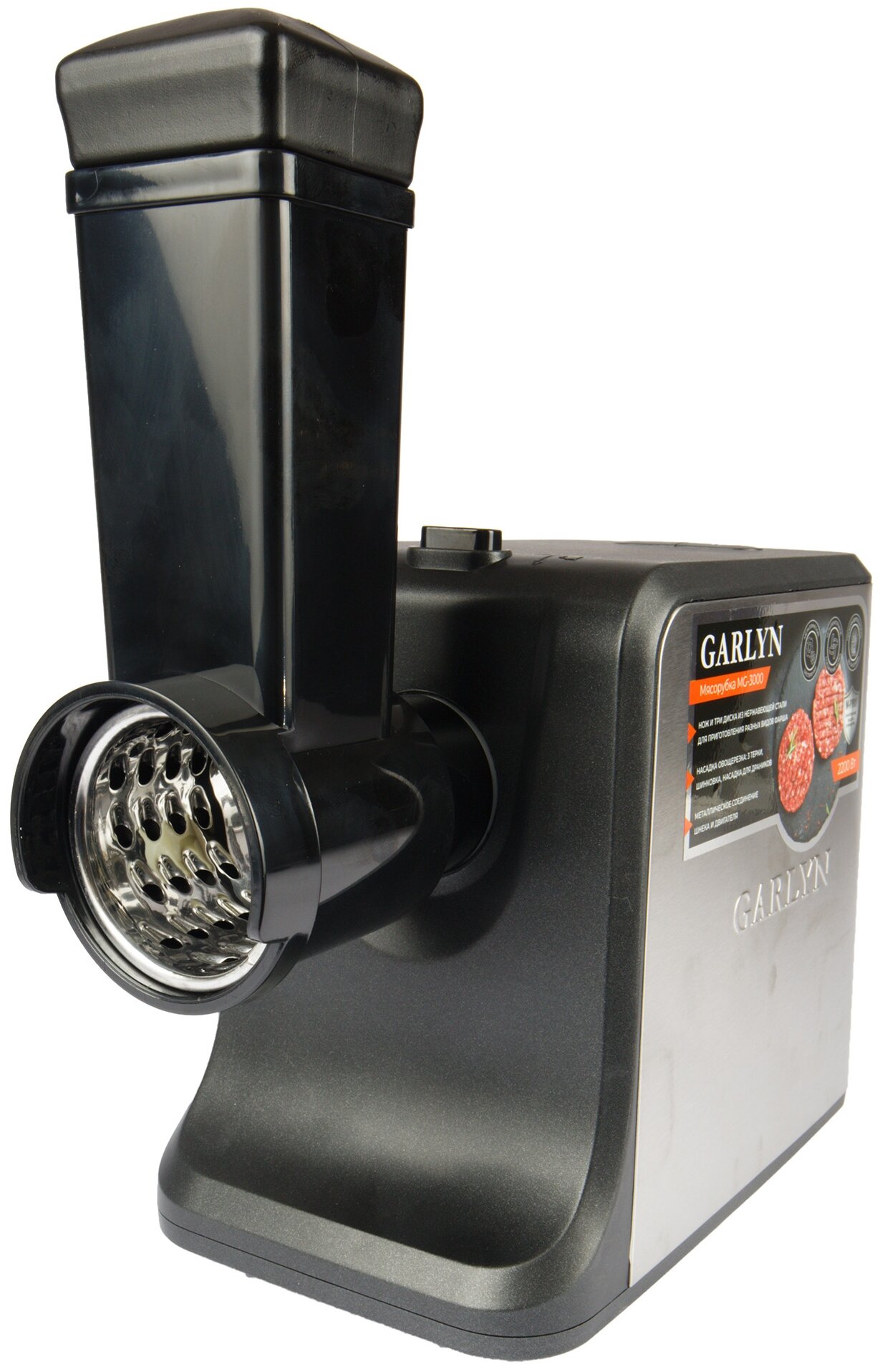 насадка для драников; материал лотка: металл; максимальная высота посуды: 120 мм; количество насадок для приготовления колбас: 2; количество насадок-терок: 4; количество насадок для шинковки: 1