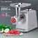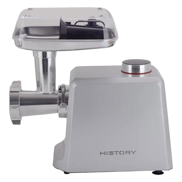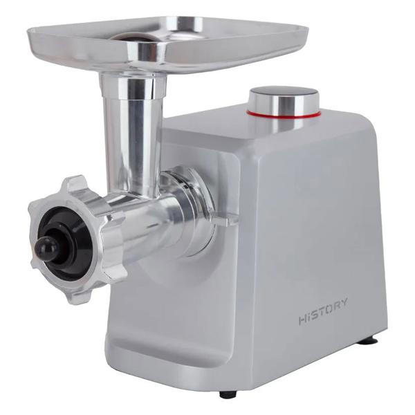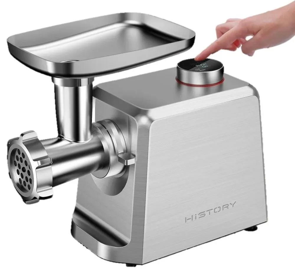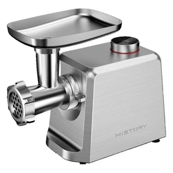 Электромясорубка HiSTORY IMG-XD420, серебристая, оснащена дисплеем с электронным управлением, который отображает время работы, две скорости и четыре режима работы. В наличии световые и звуковые индикаторы включения и работы. Корпус и комплектующие изготовлены из литого алюминия. Мотор мощностью 2000 Вт обеспечивает производительность до 2,5 кг/мин. Он защищен от перегревания и перегрузки. При попадании с отсек твердого предмета устройство автоматически выключится. Максимальный уровень шума — 80 дБ.