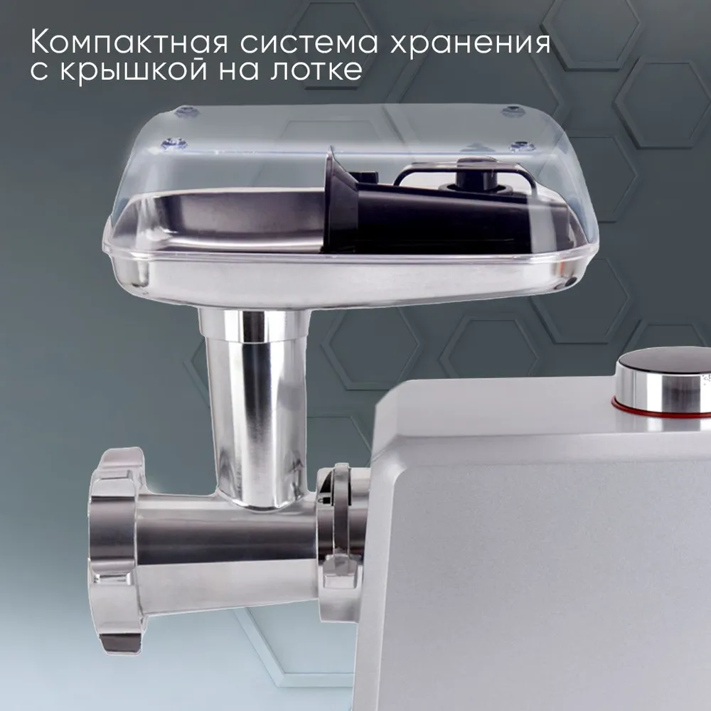 Для безопасности использования предусмотрен фиксатор насадок. В комплект входят: стальной самозатачивающийся нож, толкатель, две насадки — для кеббе и сосисок. В лотке оборудована система хранения комплектующих. Устойчивость и защиту поверхности от царапин обеспечивают ножки-присоски. Параметры модели: вес — 4,05 кг, габариты — 33,5х36,5х17 см. Прибор питается от сети 220-240 В, относится к I классу защиты от поражения электрическим током.