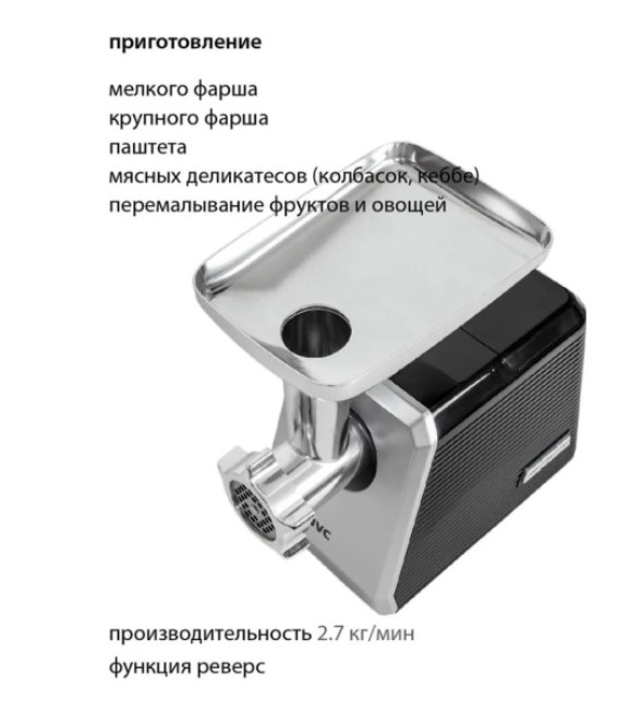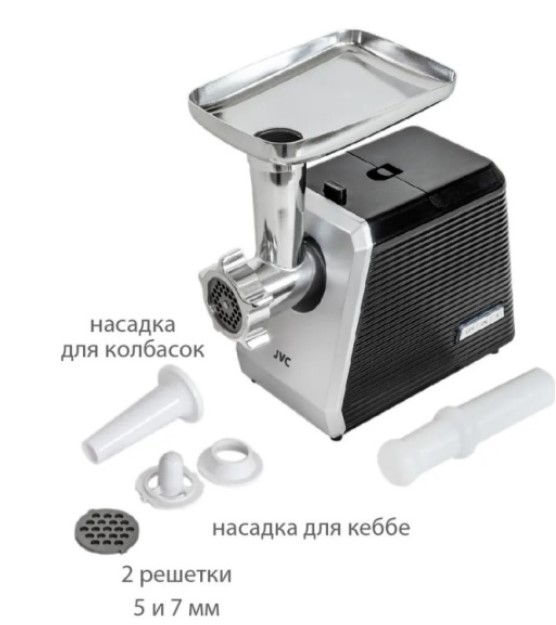 Компактная стильная электрическая мясорубка JVC с насадками для колбасок и кеббе станет незаменимым помощником и облегчит труд любой хозяйке. Корпус мясорубки выполнен в лаконичном дизайне, в его конструкции нет ничего лишнего, материал из качественного ABS пластика, который частично поглощает звук, производимый мотором, а прорезиненные ножки гасят вибрацию. Загрузочный лоток мясорубки сделан из высококачественного пищевого пластика.