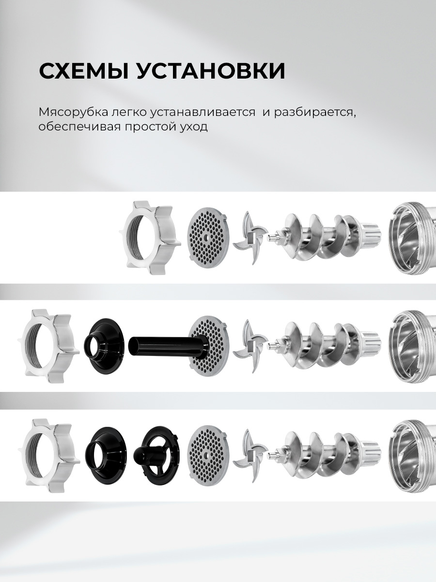 Овощерезка, Диск для крупного помола, Диск для мелкого помола, Диск для среднего помола, Насадка для кеббе, Насадки для колбасок, Нож, Слайсер, Слайсер с рифлением, Терка для крупной соломки, Терка для мелкой соломки, Универсальная терка