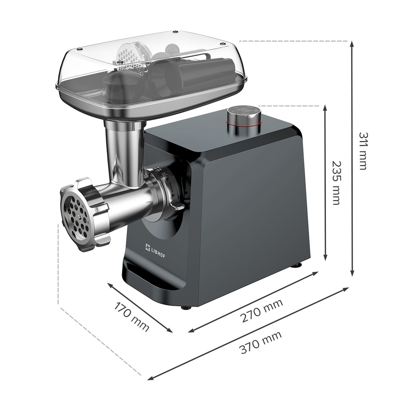 Электромясорубка Libhof MG800b в корпусе черного цвета — мощное устройство, которое легко и быстро измельчит мясо, овощи и другие продукты. Модель обладает двумя скоростями и реверсом, что обеспечивает комфортную работу. Уровень шума не превышает 90 дБ. Производительность мясорубки — до 2 кг фарша в минуту. Номинальная мощность — 800 Вт, мощность при блокировке вала — 1613 Вт.