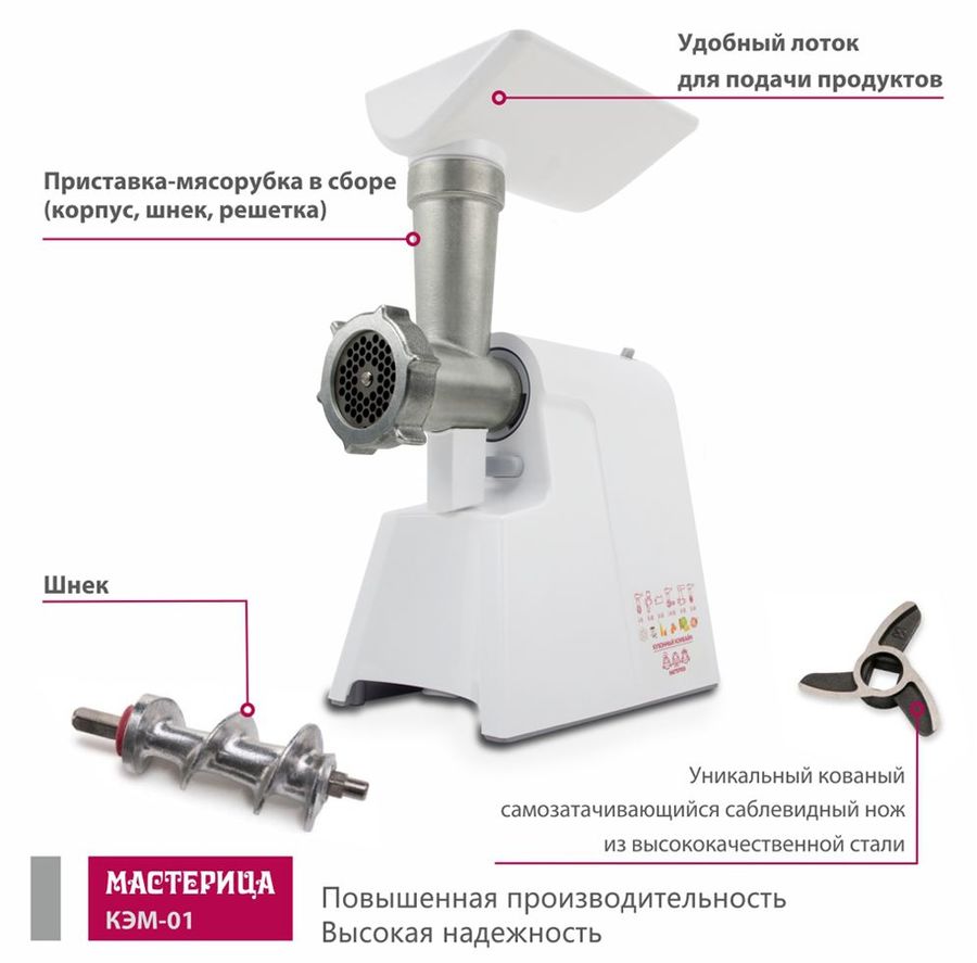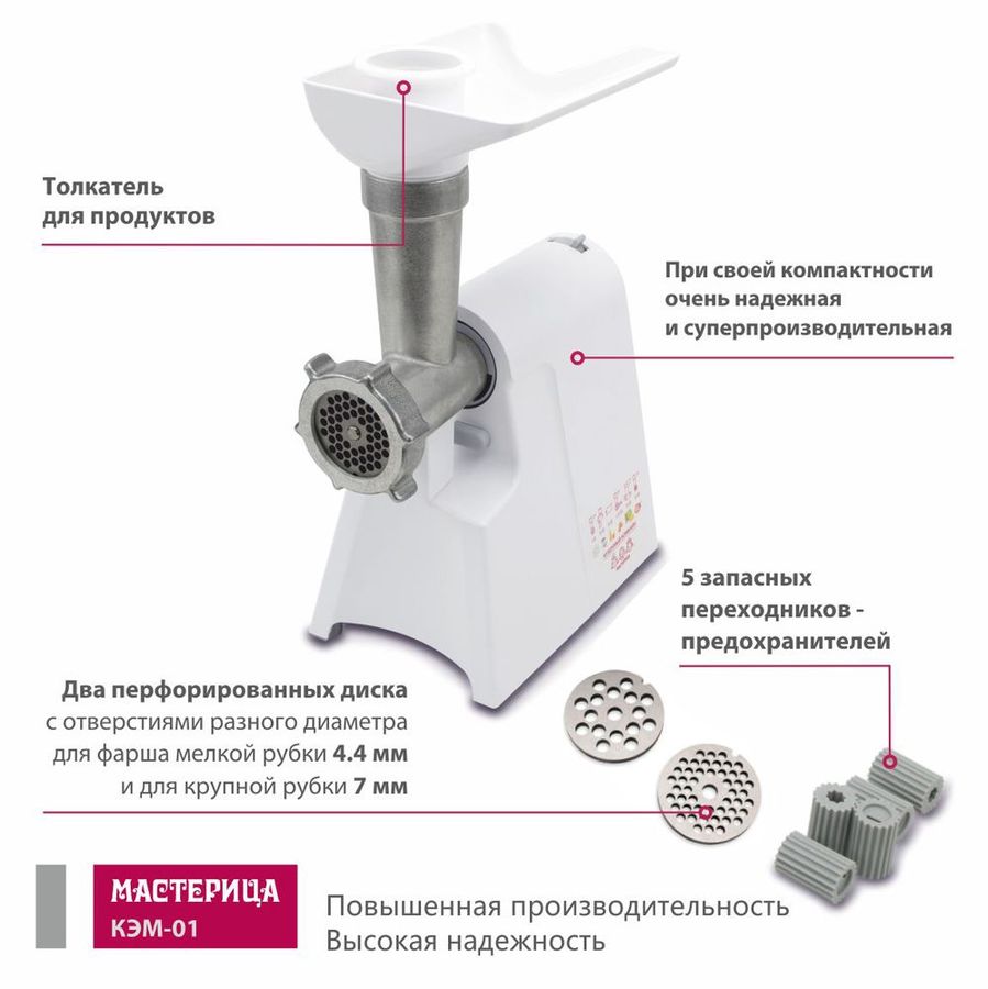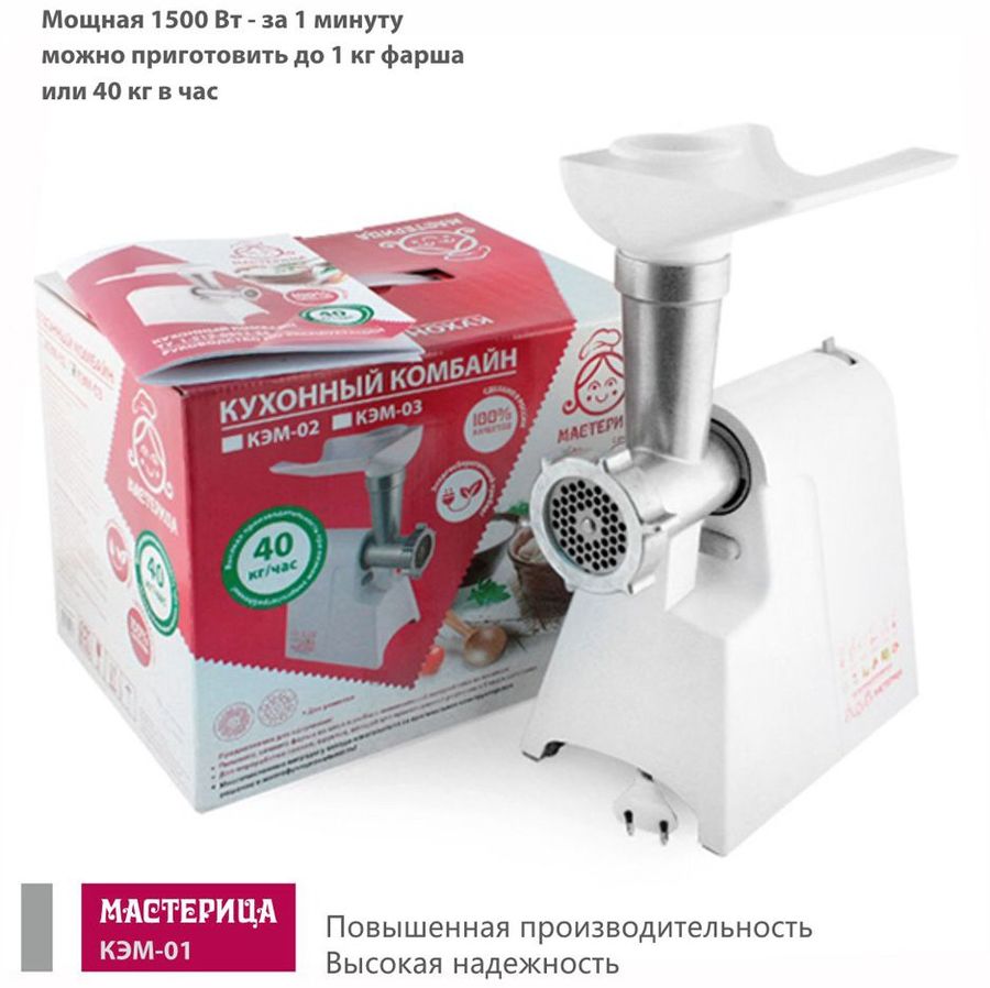 Для приготовления колбас и сосисок, фарша и пюре в домашних условиях стоит воспользоваться мясорубкой МАСТЕРИЦА КЭМ-01, которая способна за несколько минут работы измельчить продукт любой твердости. В комплекте идет два перфорированных диска, которые предназначены для приготовления фарша. Мощность при блокировке вала составляет 600 Вт. Производительность составляет 0,67 кг/мин. Защита двигателя от перегрузки позволяет предохранять двигатель от износа. Мясорубка способна работать в 3 скоростных режимах.