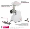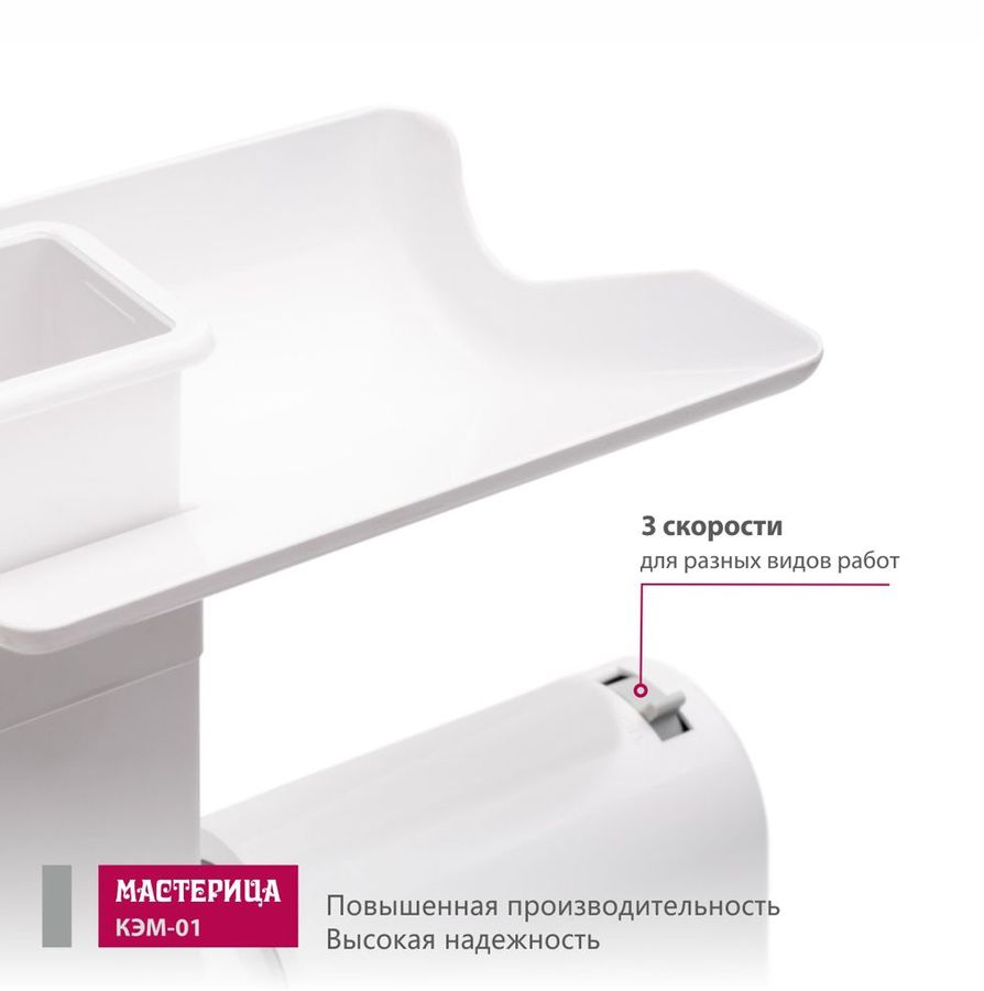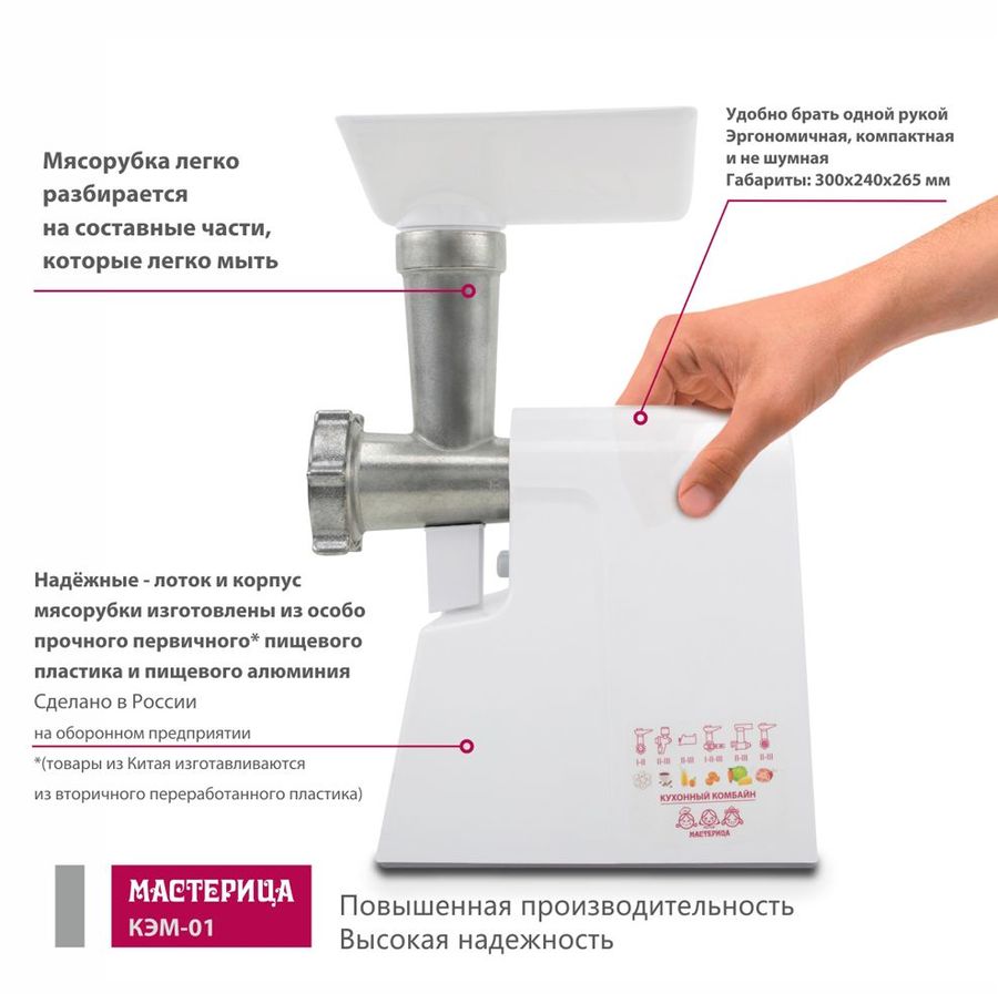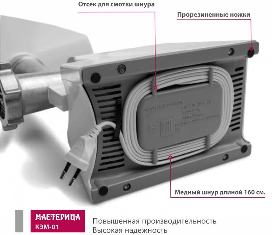 В корпусе есть специальный отсек, который предназначении для хранения шнура. После окончания работы с мясорубкой нужно лишь аккуратно сложить провод и поместить его в отсек. Длина сетевого шнура составляет 1,6 м. Мясорубка очень проста и удобна в эксплуатации. Лоток и корпус мясорубки МАСТЕРИЦА КЭМ-01 изготовлены из качественного пластика. Корпус имеет белый цвет. Вес мясорубки составляет 4,5 кг.