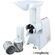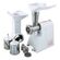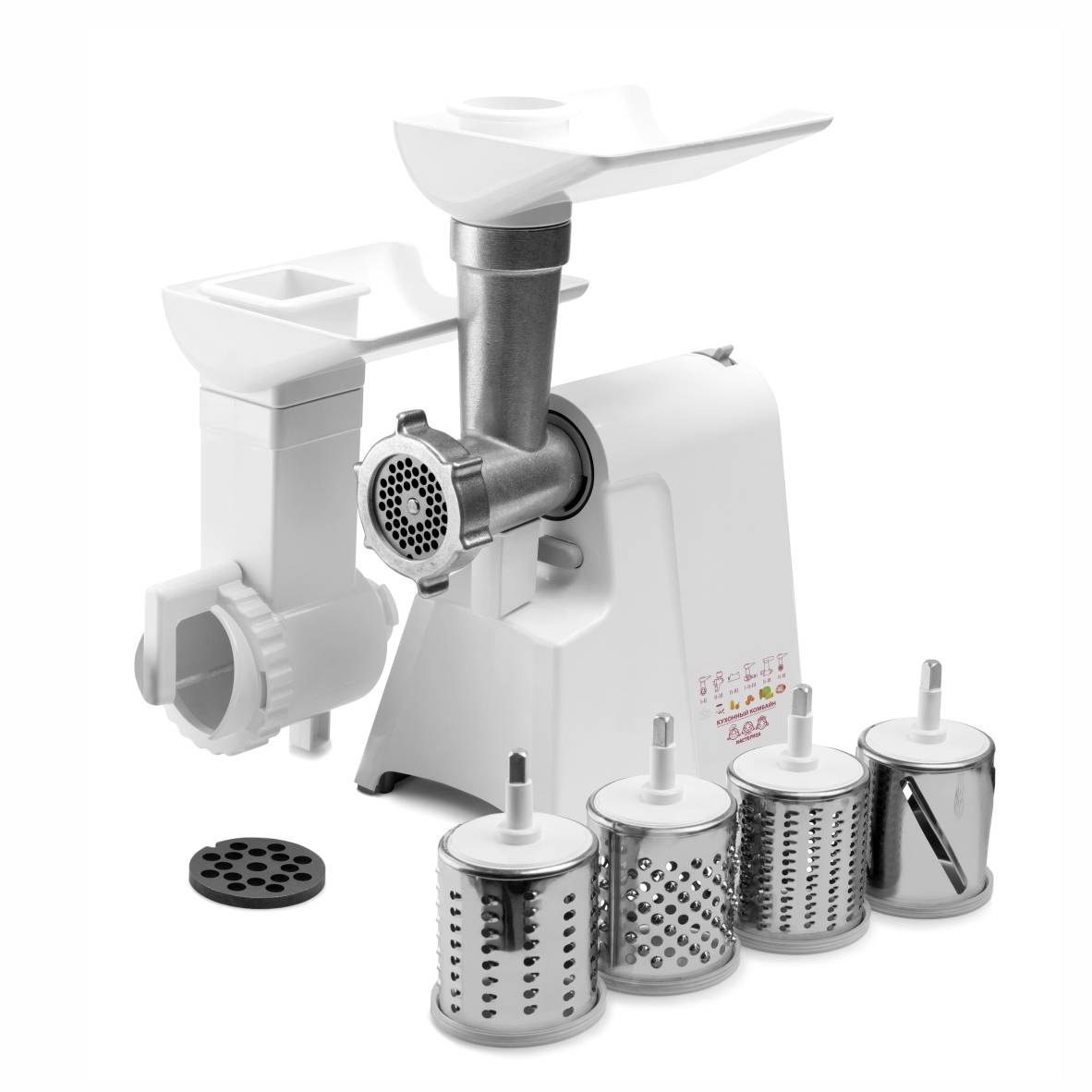 Корпус прибора и приемный лоток выполнены из высокопрочного пищевого пластика, а шнек — из металла. В вашем распоряжении три скорости измельчения и два перфорированных диска. Последние, к слову, различаются по диаметру отверстий, 4.4 и 7 мм соответственно. В комплект входят пять запасных переходников и три барабана для шинкования и перетирания продуктов с отдельным толкателем и лотком.