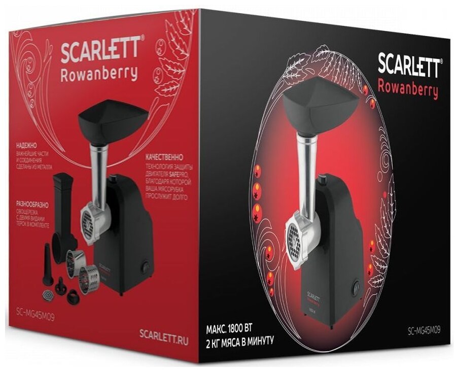 Мясорубка Scarlett SC-MG45M09 – это прибор высокой производительности для измельчения сырых и обработанных продуктов, натирания и шинковки, а также приготовления колбас и кеббе. С помощью этой модели вы сможете легко и быстро переработать даже жилистое мясо или твёрдые овощи. Мясорубка оснащена износостойким ножом, выполненным из качественной высокопрочной стали. Помимо насадки-мясорубки для приготовления фарша из разных продуктов в комплектацию входят тёрка и шинковка для овощей и фруктов, а также насадки для приготовления колбас и кеббе, чтобы максимально расширить возможности прибора.