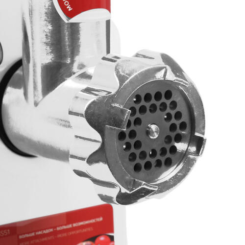 Комплектация 2 перфорированные решетки с отверстиями 5 и 7 мм, насадка для колбас, насадка для кеббе, документация, лоток, толкатель