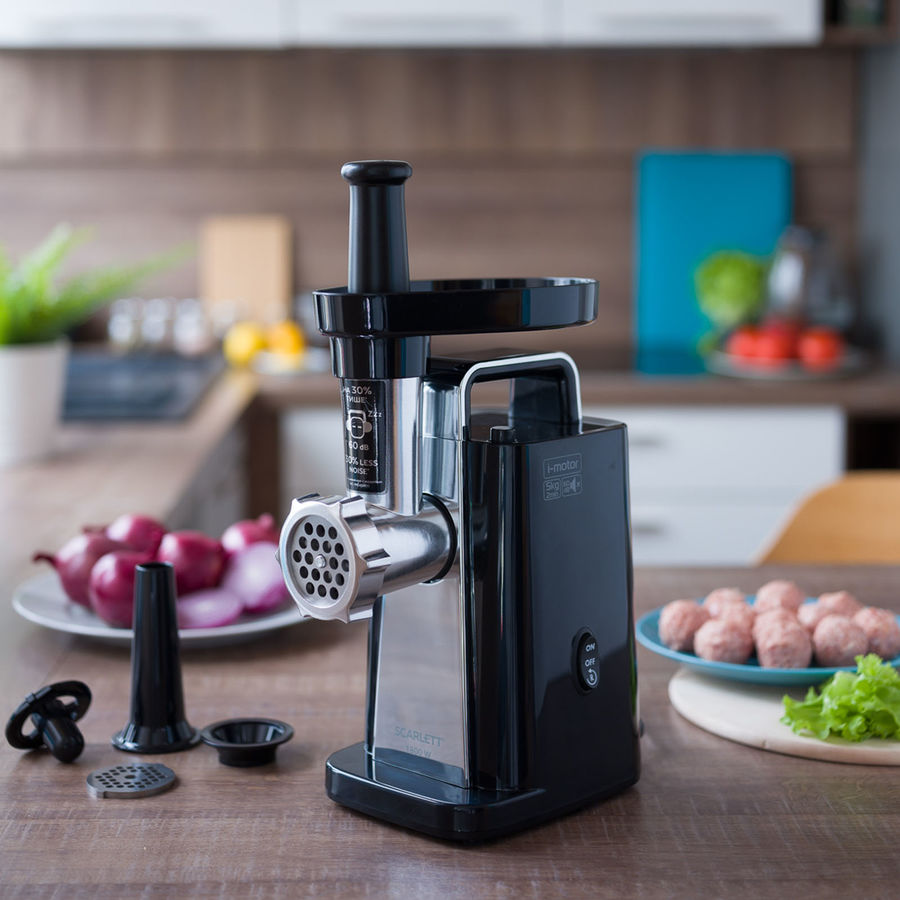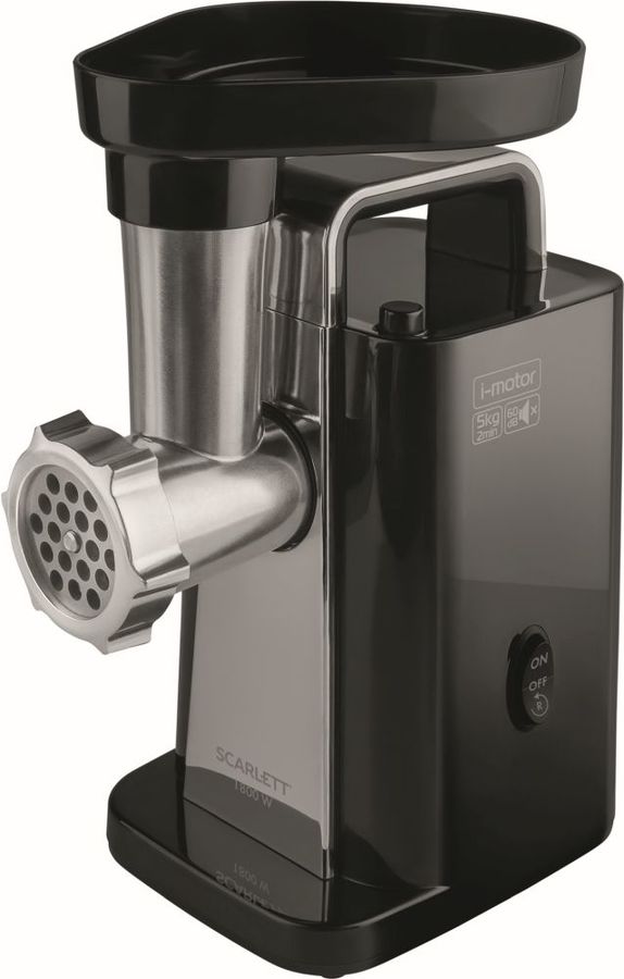 мощность 1800Вт, количество скоростей 1; реверс; защита от перегрузки; насадка для колбас; насадка для кеббе; материал лотка пластик; цвет черный