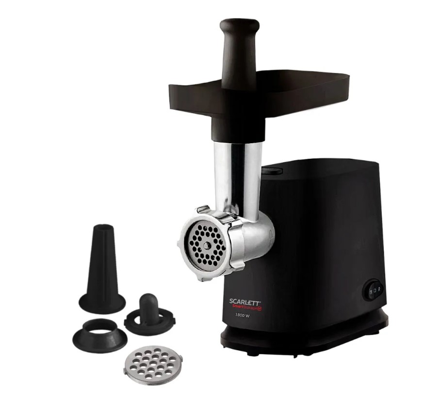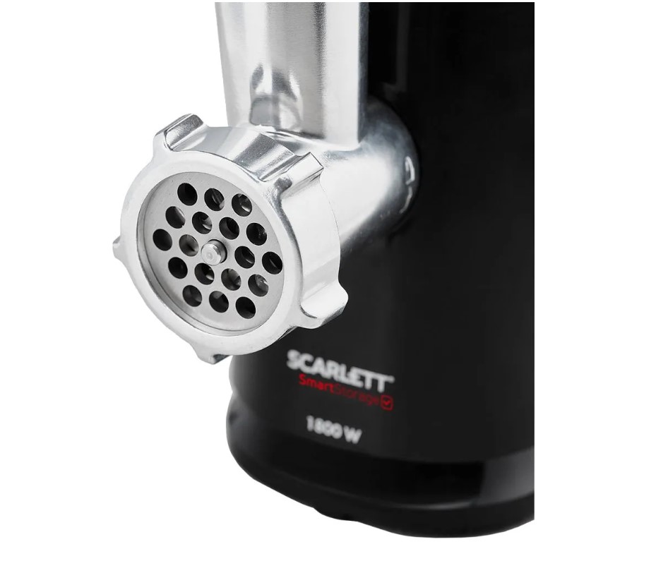 Электромясорубка Scarlett SC-MG45S71 станет вашим верным помощником в приготовлении мясных полуфабрикатов: благодаря мощному мотору она производит до 2 кг фарша в минуту. В комплект входят 2 решётки с отверстиями различного диаметра. А ещё вы сможете набить домашние колбаски и приготовить кеббе – трубочки из мясного фарша с разнообразными начинками. Соответствующие насадки прилагаются. Прокручивая жёсткое, жилистое мясо, волокна которого блокируют шнек, используйте реверс, и вам не понадобится разбирать и чистить горловину прибора. В корпусе есть специальный отсек для второго диска – он не потеряется и всегда будет под рукой. Также предусмотрено место для сматывания сетевого шнура, что очень удобно при хранении устройства. Ножки прорезинены и не позволят прибору соскользнуть со стола.