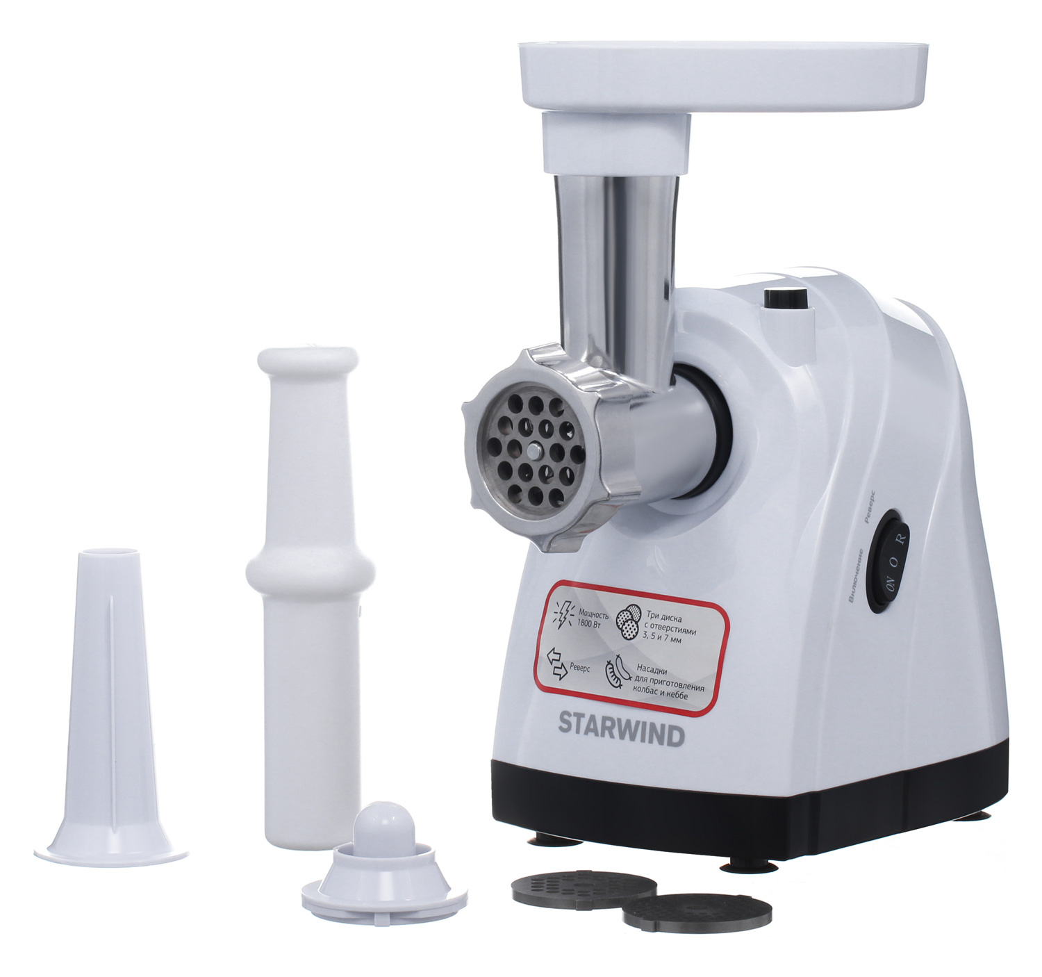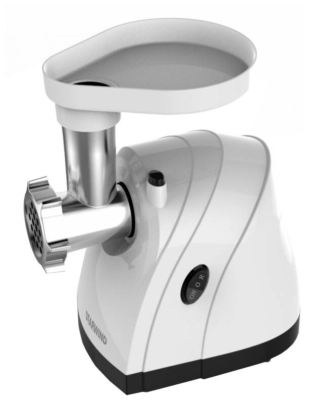Мясорубка выполненная в белом цвете, оснащена мощным мотором. Мясорубка имеет одну скорость работы и функцию реверса. Производительность прибора 2.2 кг мяса за одну минуту. В комплект входят три решетки для изготовления фарша, а также дополнительные насадки для колбас. Корпус, элементы и лоток мясорубки легко мыть и чистить. Эта модель выглядит солидно, и она, действительно, удобна в использовании, а её облик гармонично дополнит любую кухню.