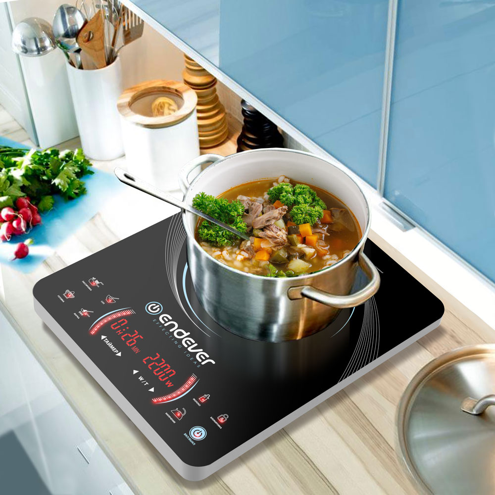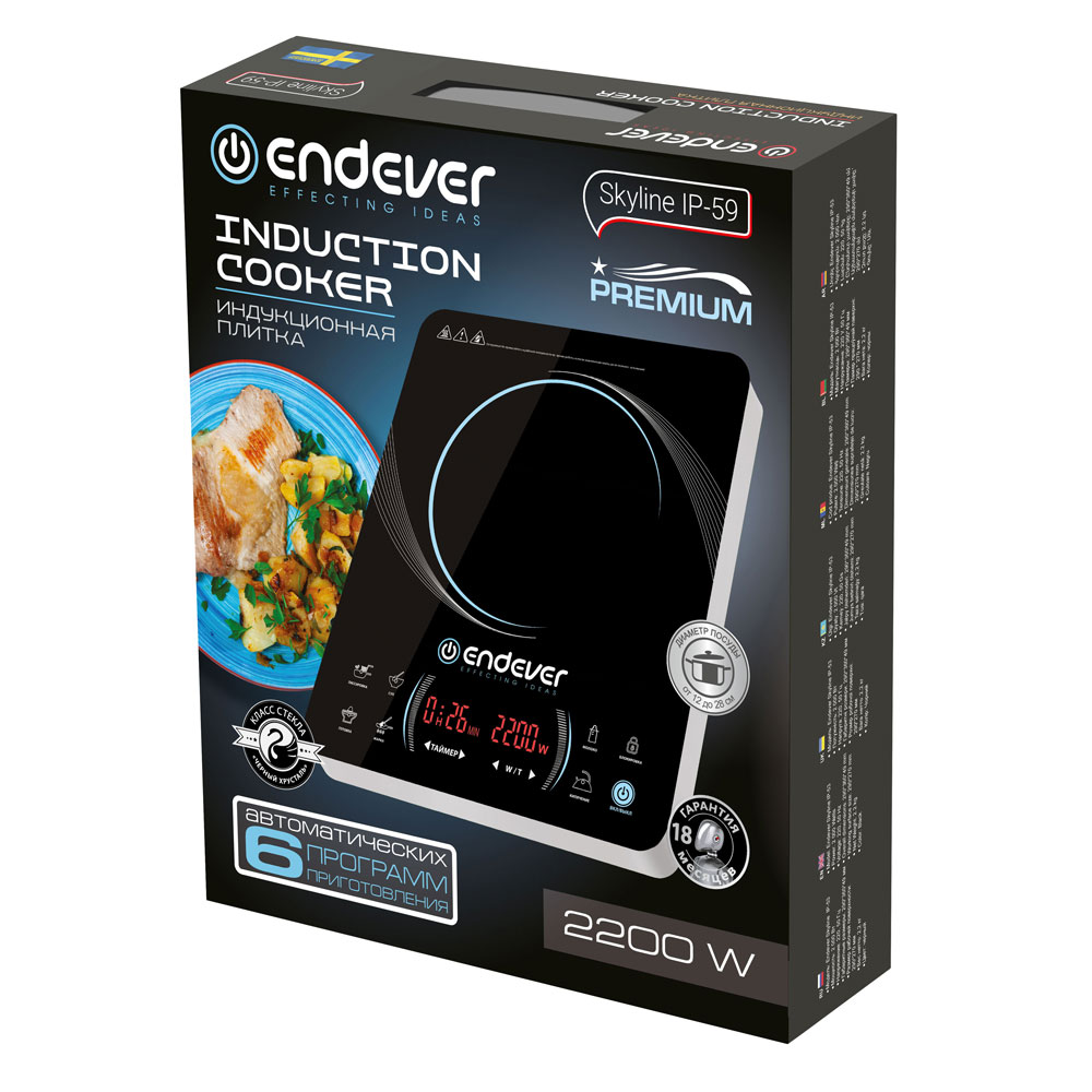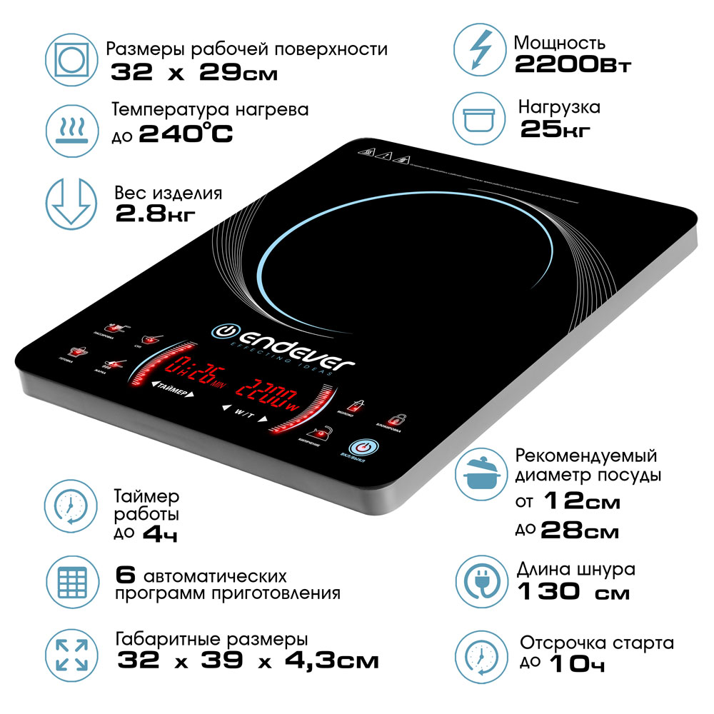 Температура нагревания: до 240°С, 6 автоматических программ приготовления, Сенсорное управление, Рабочая поверхность повышенной прочности класса "Черный хрусталь", 2 LED дисплея, Таймер отсрочки старта до 10 часов, Таймер работы до 4 часов, Функция защиты от скачков напряжения в сети, Функция защиты от перегрева, Функция блокировки, Функция автоотключения, Рекомендуемый диаметр посуды от 12 до 28 см
