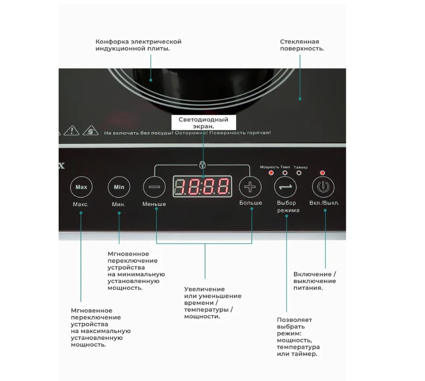 Поскольку нагревается не рабочая поверхность, а сама посуда, настольная индукционная плита работает быстрее, экономичнее и безопаснее, чем традиционная конфорочная газовая или электрическая плита. Это существенный плюс индукционной плиты. К минусам можно отнести необходимость использовать наплитную посуду только из ферромагнитных материалов (чугуна, нержавеющей и эмалированной стали) или с ферромагнитным слоем на дне. Медная, алюминиевая, стеклянная, керамическая и фарфоровая утварь для электрической индукционной плиты не годится. Кастрюли и сковороды должны иметь плоское дно диаметром 120-260 мм.Настольная индукционная плита Gemlux GL-IP-22L имеет простое и понятное сенсорное управление с несколькими режимами работы. Каждая конфорка имеет индивидуальную кнопку включения/выключения. В режиме «мощность» при помощи кнопок со стрелками задается один из предустановленных уровней мощности: для левой зоны – от 200 до 2000 Вт (по умолчанию – 1200 Вт) с шагом 200 Вт, для правой зоны – от 200 до 1400 Вт (200, 400, 600, 800, 900, 1000, 1100, 1200, 1300, 1400 Вт; по умолчанию – 1000 Вт). В режиме «температура» задается температура нагрева для каждой зоны в диапазоне 60-240оС с шагом 20оС (по умолчанию – 180оС); в режиме «таймер» – длительность приготовления пищи (от 0 до 180 минут с шагом 5 минут).