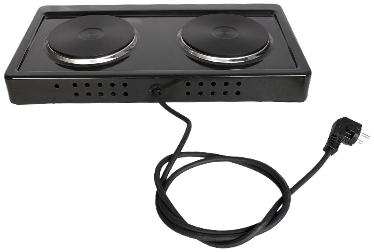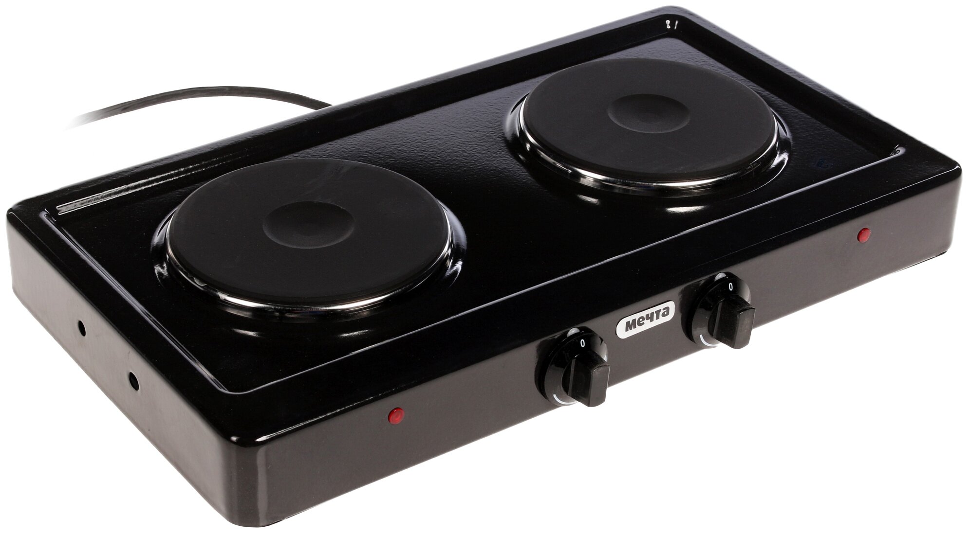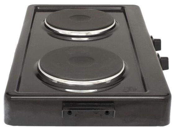 тип конфорок: чугунные; мощность каждой конфорки: 1 кВт, диаметр 14,5 см; бесступенчатое регулирование мощности; индикация включенного состояния электроконфорок; опорные ножки плитки оборудованы вкладышами противоскольжения; стеклоэмалевое покрытие; вес 4,5 кг