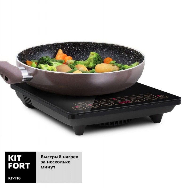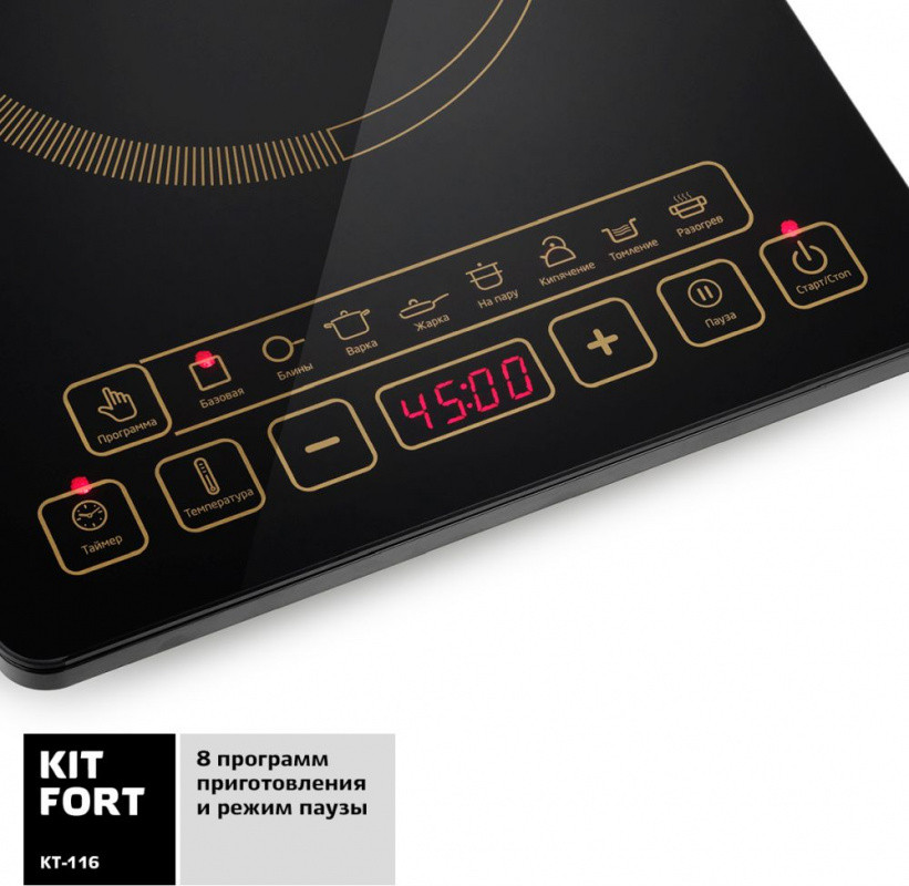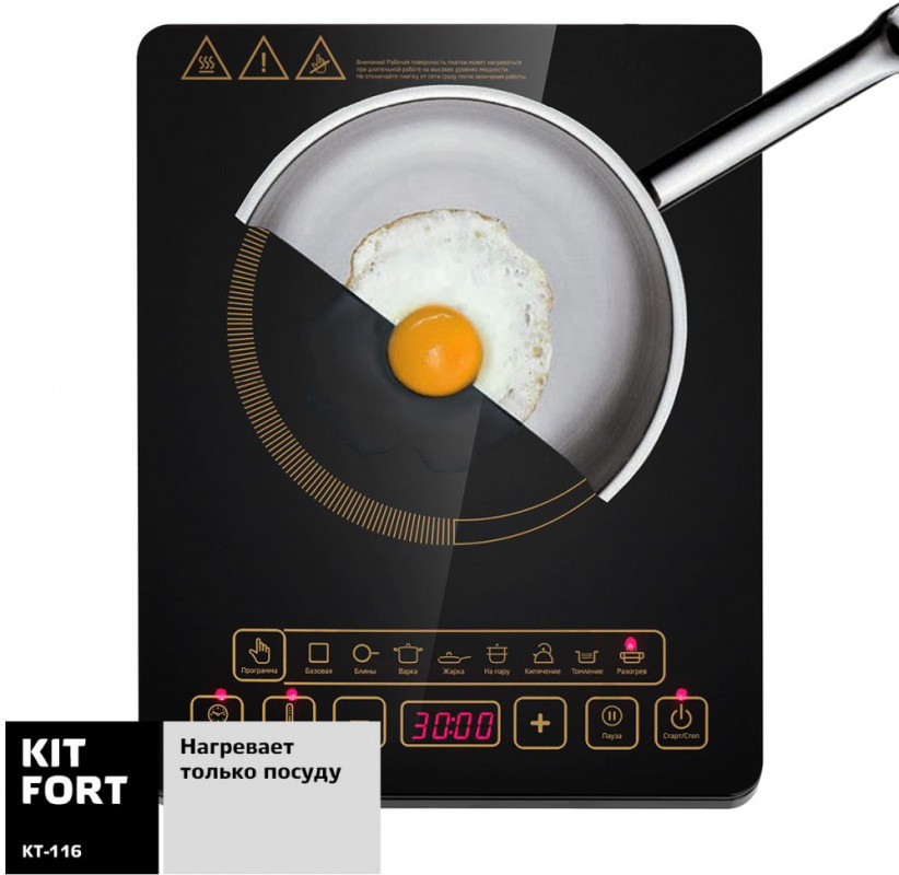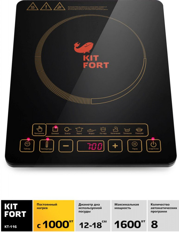 Особенности: Диаметр дна используемой посуды 12-18 см. Отключение при отсутствии посуды на плите. Кнопка пауза. Режим поддержания температуры посуды.