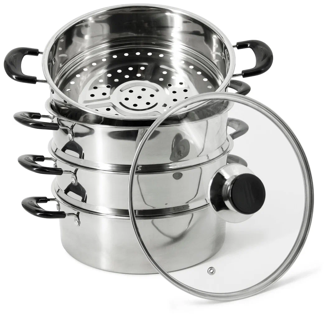 Мантоварка-пароварка Pomi d'Oro P630101 Vapore со стеклянной крышкой. Диаметр 24см. 3 перфорированных яруса, высота 7см. Нижняя часть мантоварки может использоваться как кастрюля, объем 4 литра. Изготовлена из высококачественной нержавеющей стали. Безопасна для человека и не выделяет вредных веществ при повышенных температурах. Крышка изготовлена из термостойкого стекла с отверстием для выпуска пара. Не нагревающиеся бакелитовые ручки. Перед первым использованием тщательно вымойте посуду тёплой водой с использованием моющего средства. Вытрите насухо или полностью высушите. Для гарантированного сохранения блеска стали рекомендуется только ручное мытьё без использования абразивных средств и металлических мочалок. Подходит для всех типов плит, кроме индукционных.