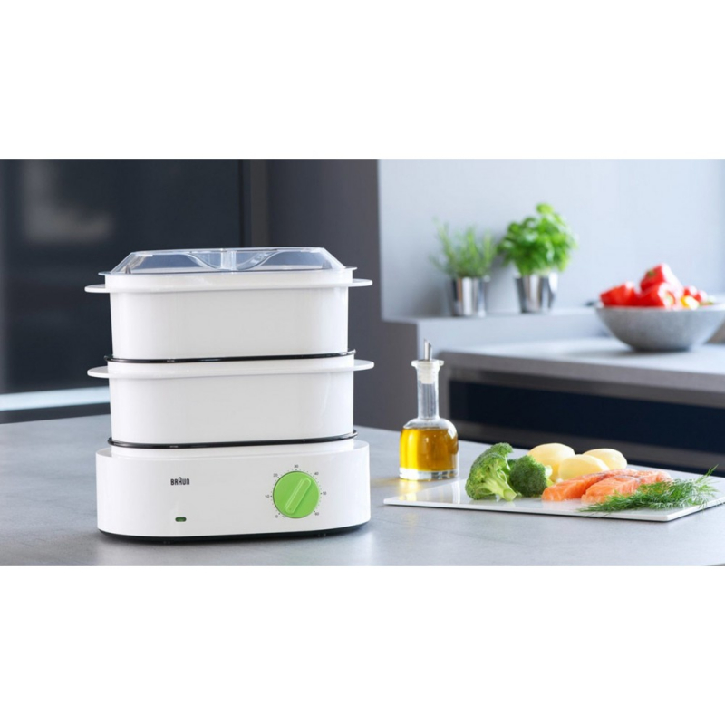 С пароваркой Braun FS3000 WH вы приготовите для всей семьи вкусные и полезные блюда без капли масла. Прибор снабжён двумя пластиковыми контейнерами, каждый объёмом 3,1 литра, что позволит вам одновременно «загружать» разные продукты. Для риса прилагается отдельная ёмкость.