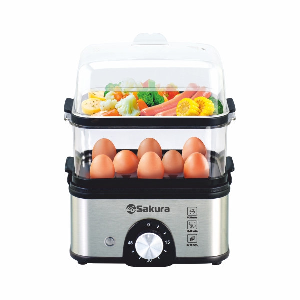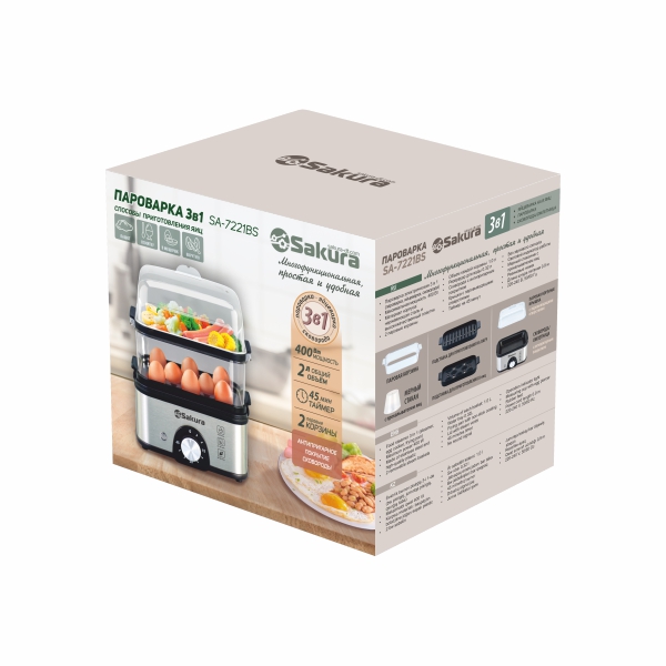 Пароварка электрическая, 3 в 1 (яйцеварка, пароварка, сковорода), мощность 300-400 Вт, 2,0 л, 2 яруса, резервуар для воды 0,32 л, механическое управление, таймер на 45 минут, отключение без воды. Цвет корпуса: нержавеющая сталь / черный. Длина шнура 90 см.