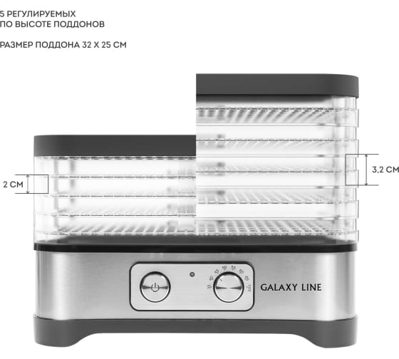 5 регулируемых по высоте съемных секций позволяют разместить в небольшом объеме максимум продуктов и добиться их наилучшего распределения для быстрого и равномерного высушивания.
