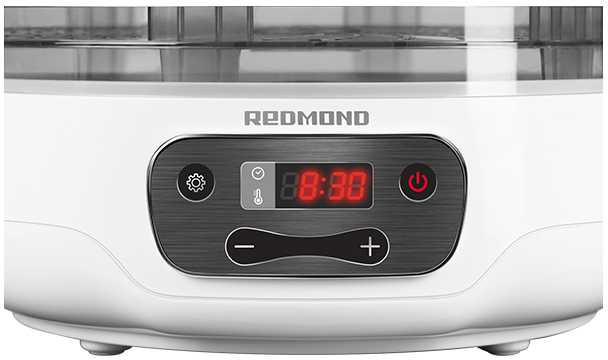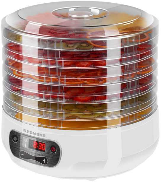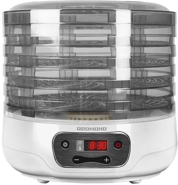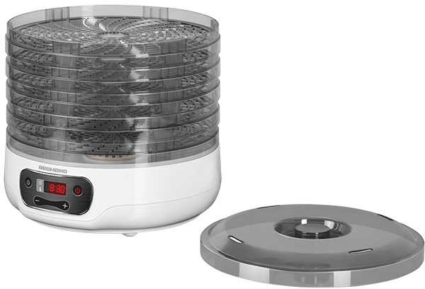 Особенности: Электросушилка RFD-0158 – это цилиндрический прибор диаметром 26 см и высотой 31 см. Устройство компактно, оно не занимает много места на кухне. Кроме того, сушилка потребляет минимум электрической энергии при круглосуточной работе. Цифровой дисплей.