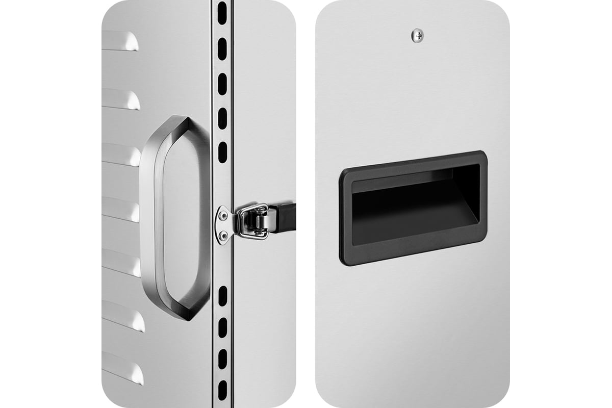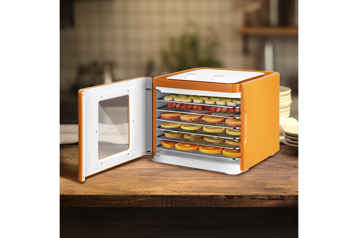 В сушилке установлен нагревательный элемент, а также вентилятор, обеспечивающий равномерное распределение нагретого воздуха по всему объему камеры. Благодаря горизонтальному обдуву смешение запахов при одновременной сушке разных продуктов минимально.