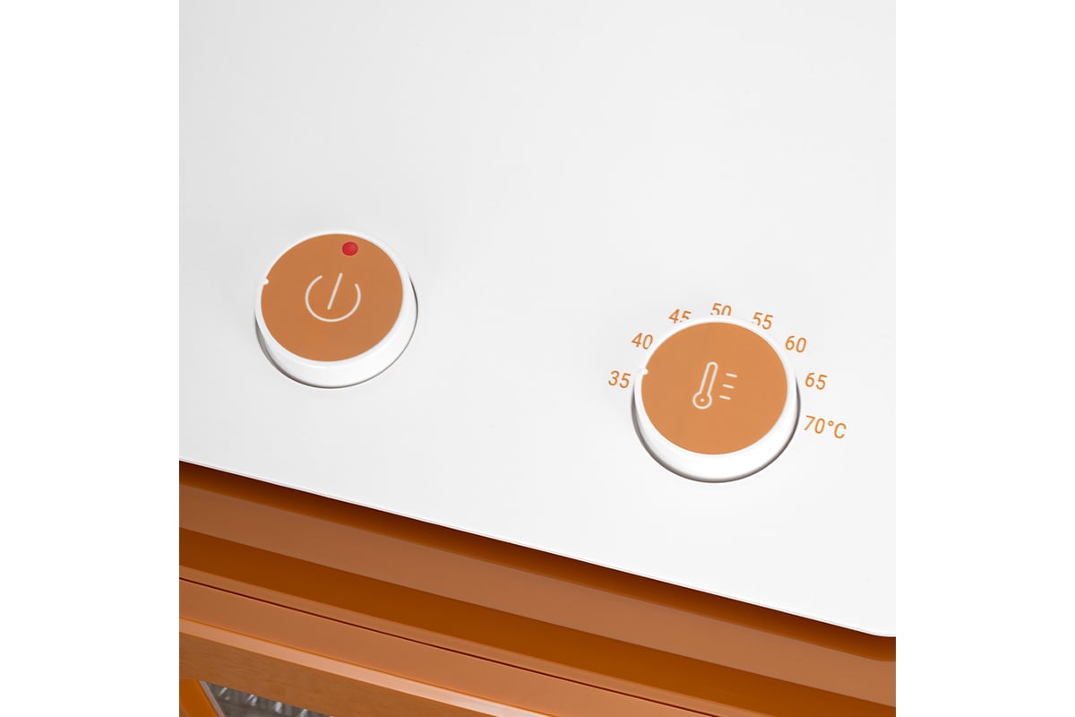 Прибор позволяет установить температуру сушки от 35 до 70 оС.У сушилки плавная регулировка температуры.