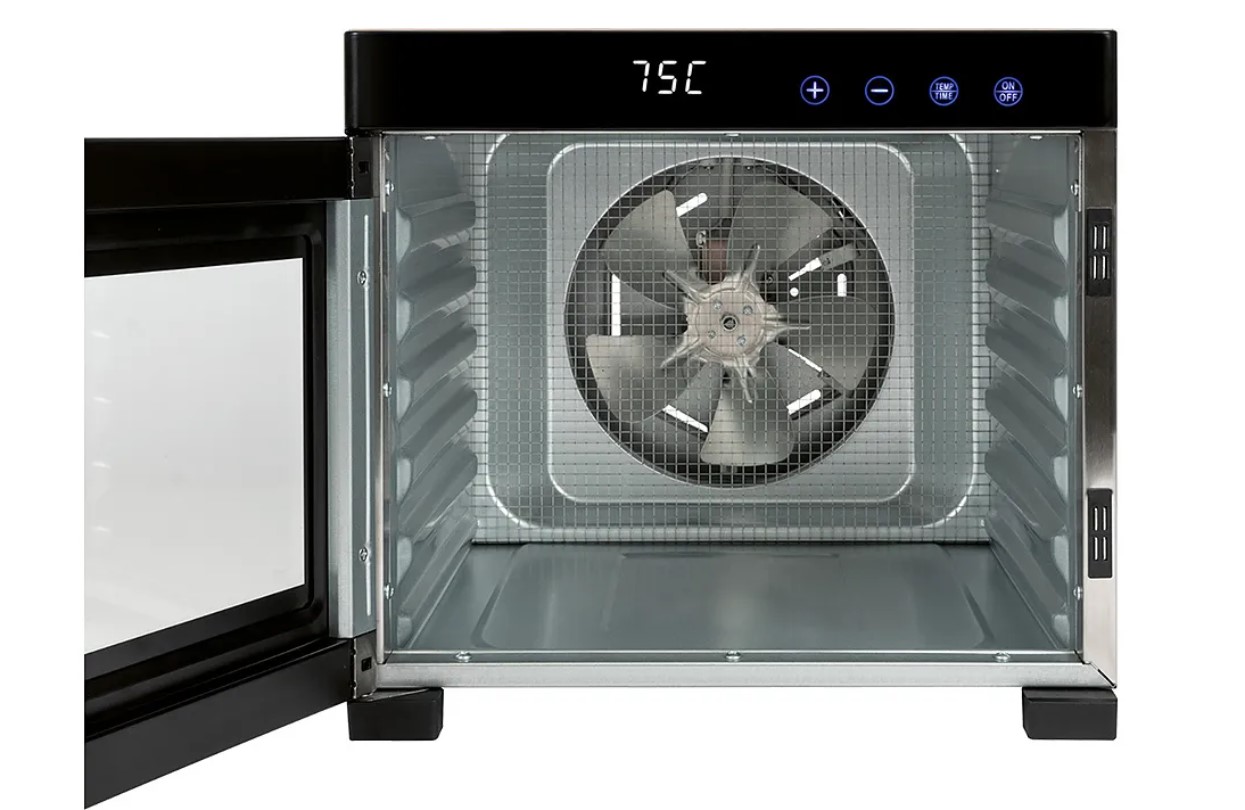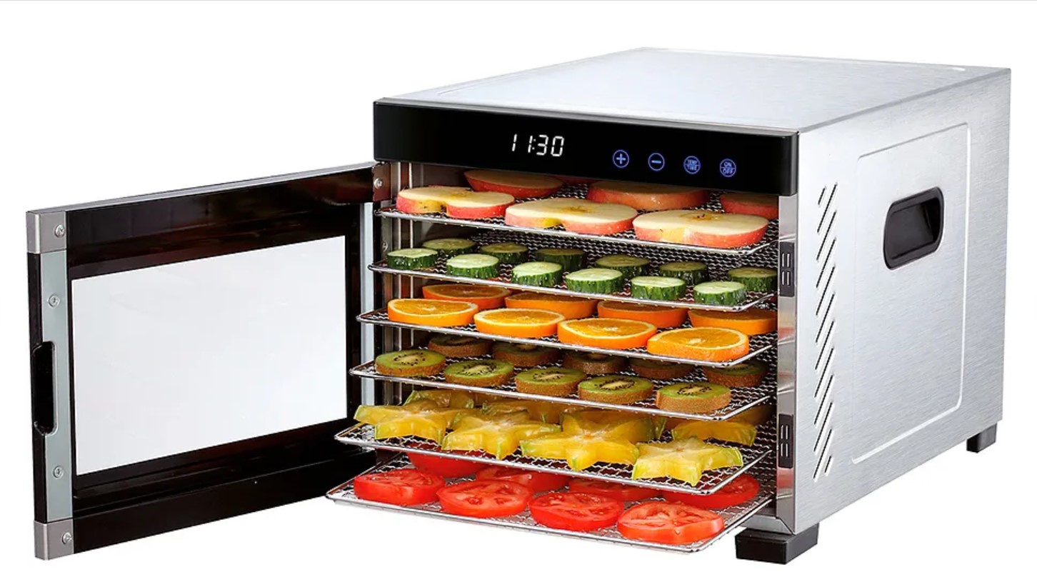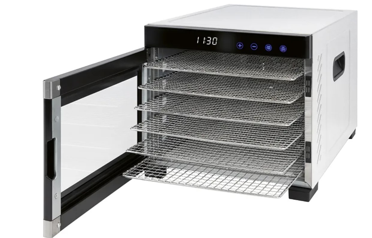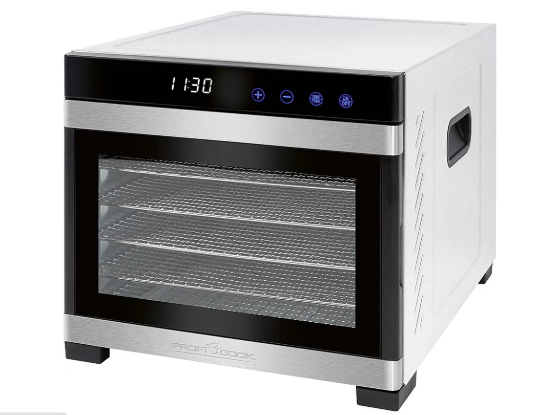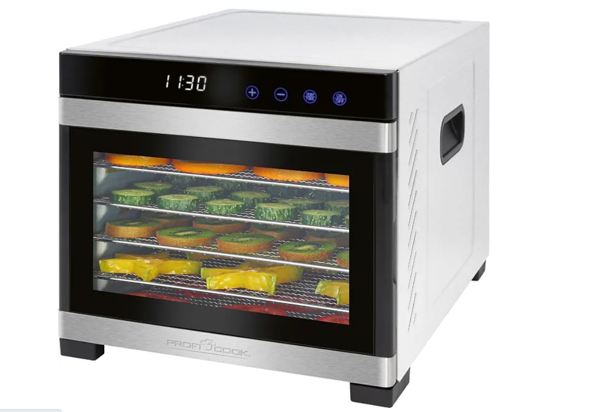 Сушилка для фруктов Profi Cook PC-DR 1218 inox из нержавеющей стали для сушки фруктов, овощей, трав, мяса, грибов, рыбы и многого другого. Возможно приготовление, например, батончиков мюсли, вяленой говядины, сушеного овощного бульона, гранолы или овощных чипсов. Равномерное распределение тепла благодаря циркуляции воздушного потока на 360° и цифровому термостату гарантирует, что в продуктах не остается воды, а время сушки сокращается.