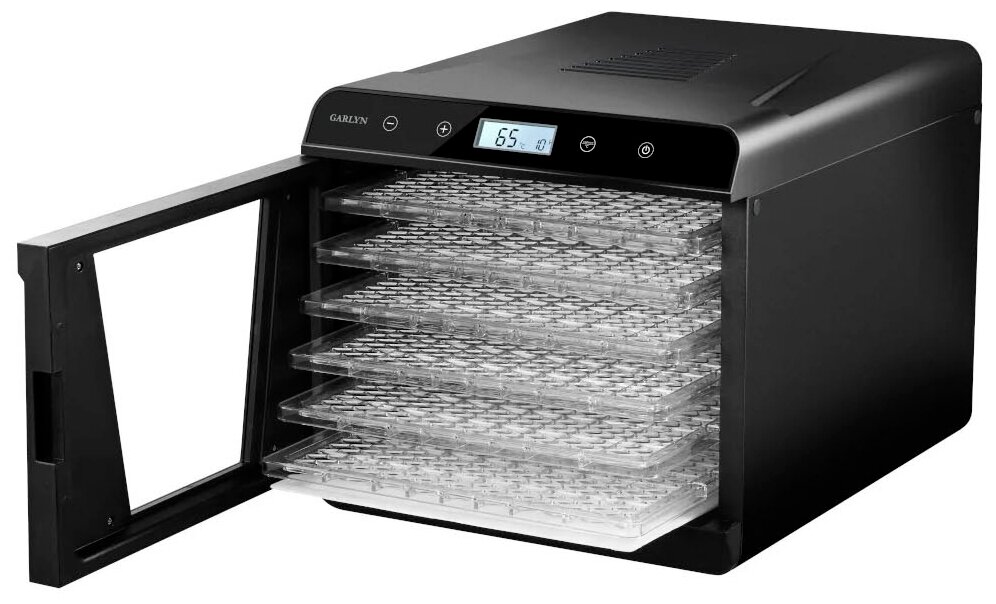 Garlyn D-09 обладает продуманной конструкцией и компактными размерами, благодаря чему она не занимает много места на кухонном столе. Корпус и поддоны сушилки выполнены из пластика, а для управления предусмотрена сенсорная панель и дисплей. В комплекте поставляется 6 съемных поддонов, а также поддоны для приготовления пастилы и сушки трав.