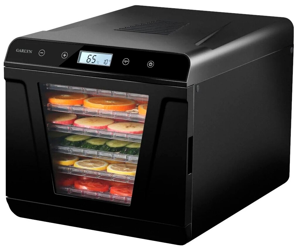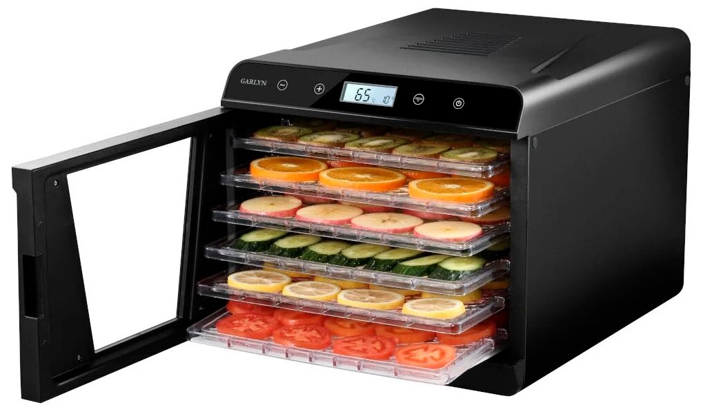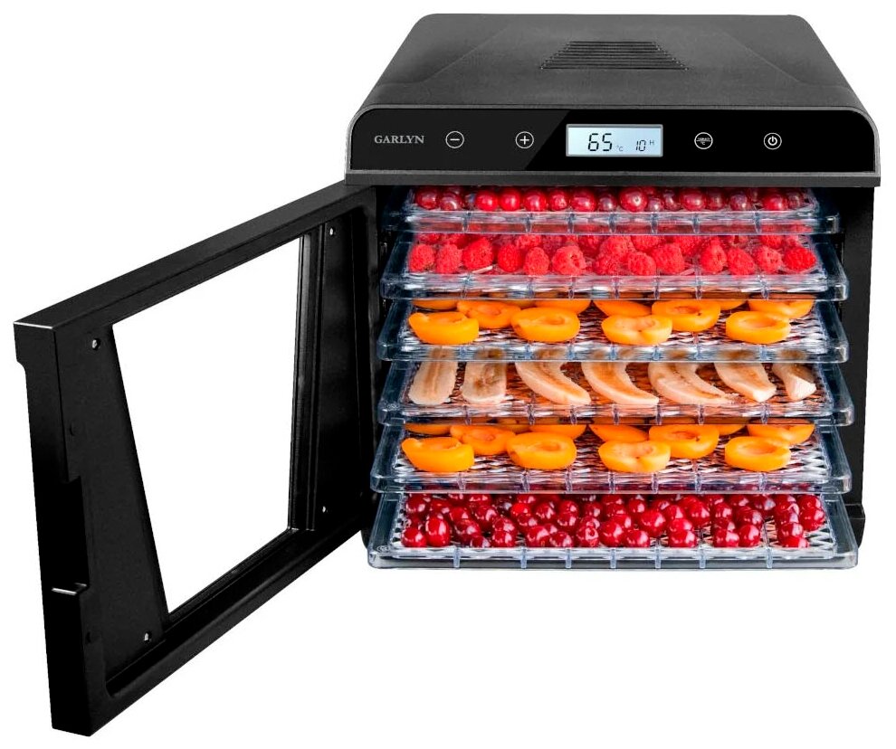 Garlyn D-09 представляет собой функциональную и удобную сушилку, которая позволит быстро и эффективно высушить овощи или фрукты. В модели предусмотрено 6 поддонов размером 30 х 32 см, что позволяет вместить большое количество продуктов.