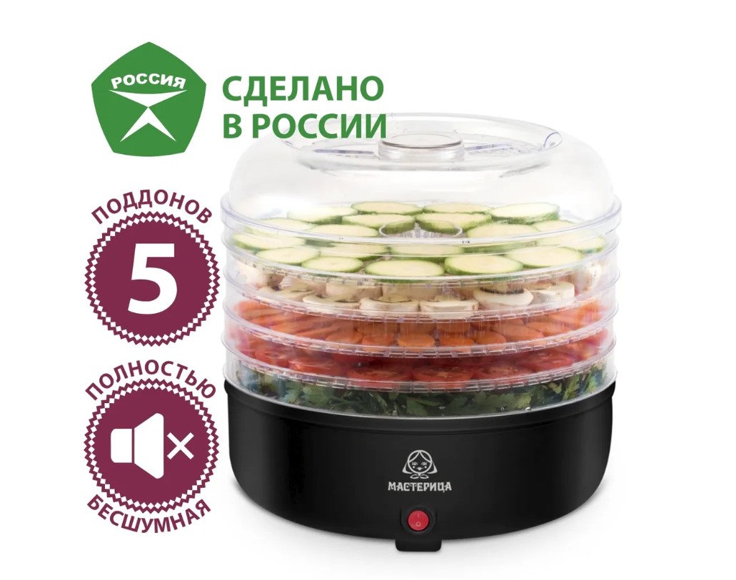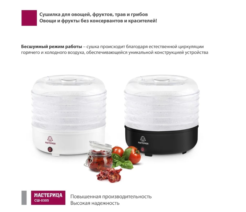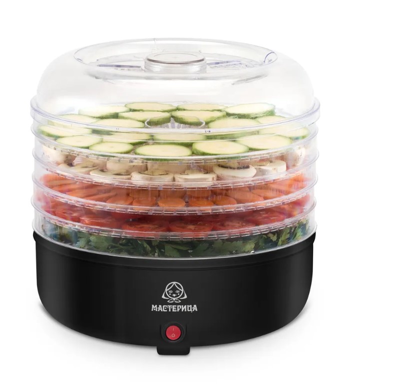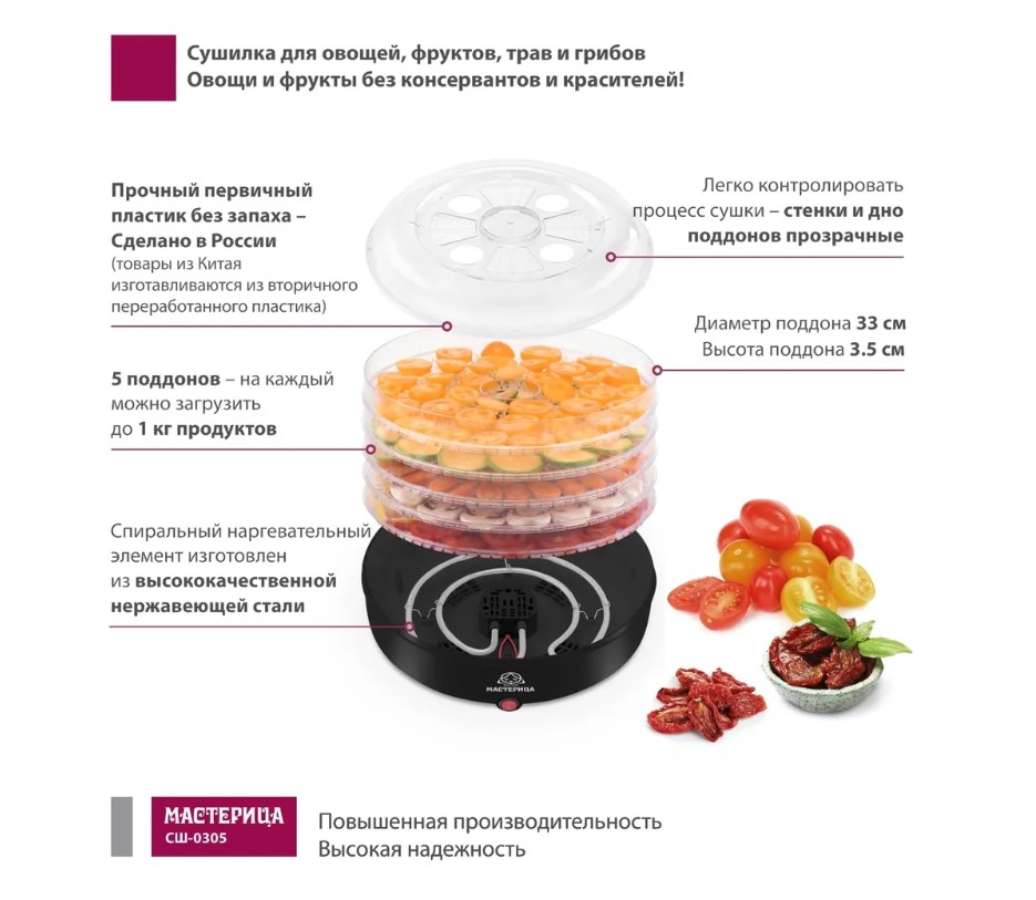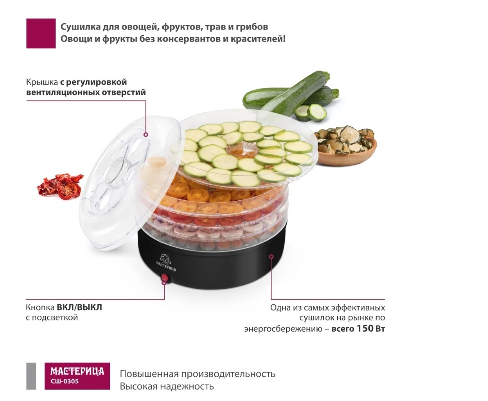Позволяет сушить овощи, фрукты, грибы, травы, ягоды, сохраняя все полезные микроэлементы. Мощность 150 Вт; 5 прозрачных поддонов. Объем сушильной камеры - 19 л; загрузка на одном поддоне до 1 кг. Советы и рекомендации по сушке овощей в руководстве по эксплуатации. Размеры: высота 320 мм, диаметр 330 мм.