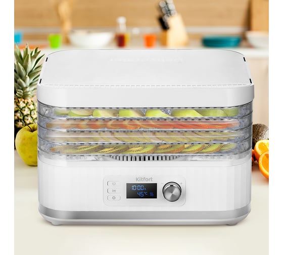 Электрическая сушилка для овощей и фруктов КТ-1959 предназначена для сушки овощей, фруктов, ягод, грибов, корнеплодов, трав и зелени, а также хлеба.