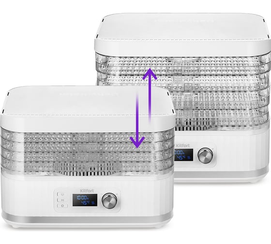 Сушилка имеет в комплекте 5 поддонов из прозрачного пластика, поэтому вы легко можете наблюдать за процессом сушки. Поддоны устанавливаются друг на друга.