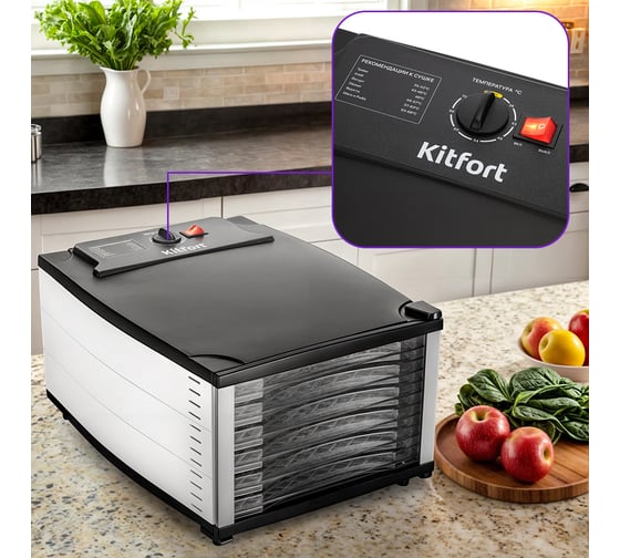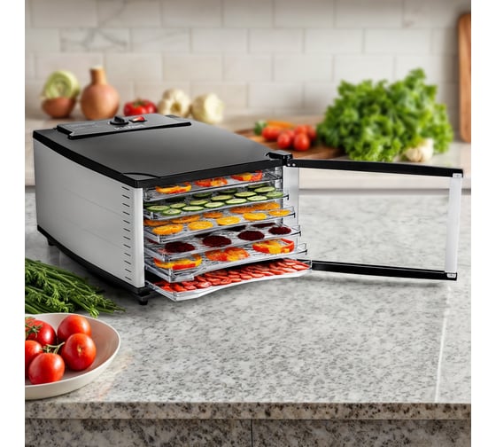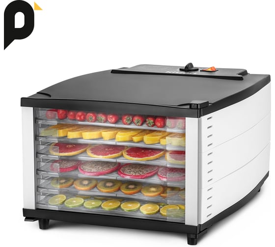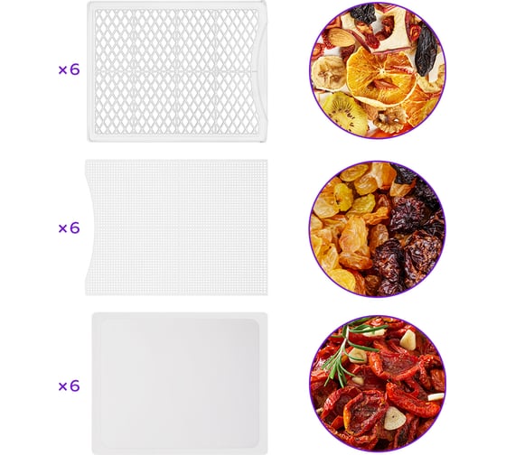 Сушилка имеет в комплекте 6 пластиковых поддонов, 6 сеток для мелких продуктов и 6 пластиковых сплошных поддонов.