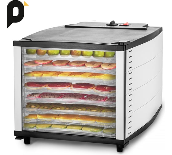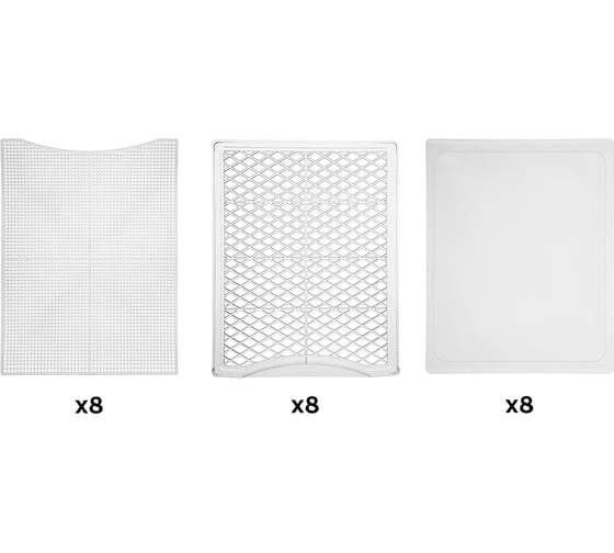Сушилка имеет в комплекте 8 пластиковых поддонов, 8 сеток для мелких продуктов и 8 пластиковых сплошных поддонов.