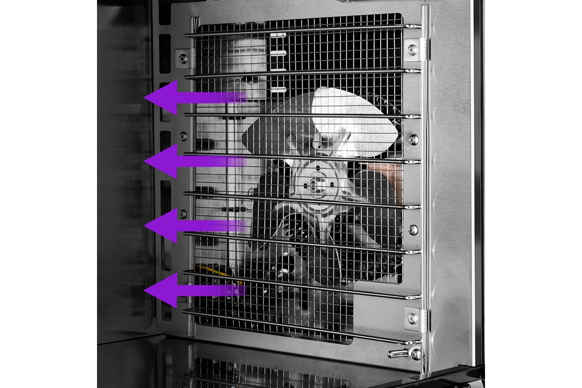 В сушилке установлен мощный нагревательный элемент, а также вентилятор, обеспечивающий равномерное распределение нагретого воздуха по всему объему камеры. Благодаря горизонтальному обдуву смешение запахов при сушке одновременно разных продуктов минимально.