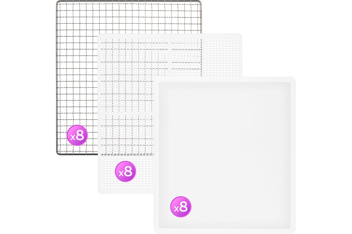 В комплект сушилки входят 8 поддонов из нержавеющей стали, 8 сеток и 8 поддонов для пастилы.